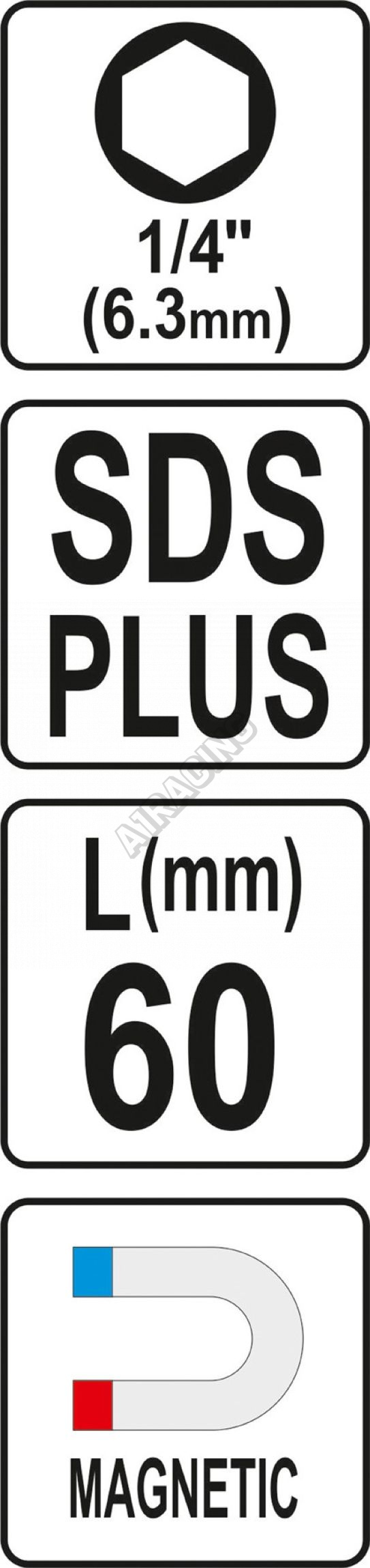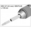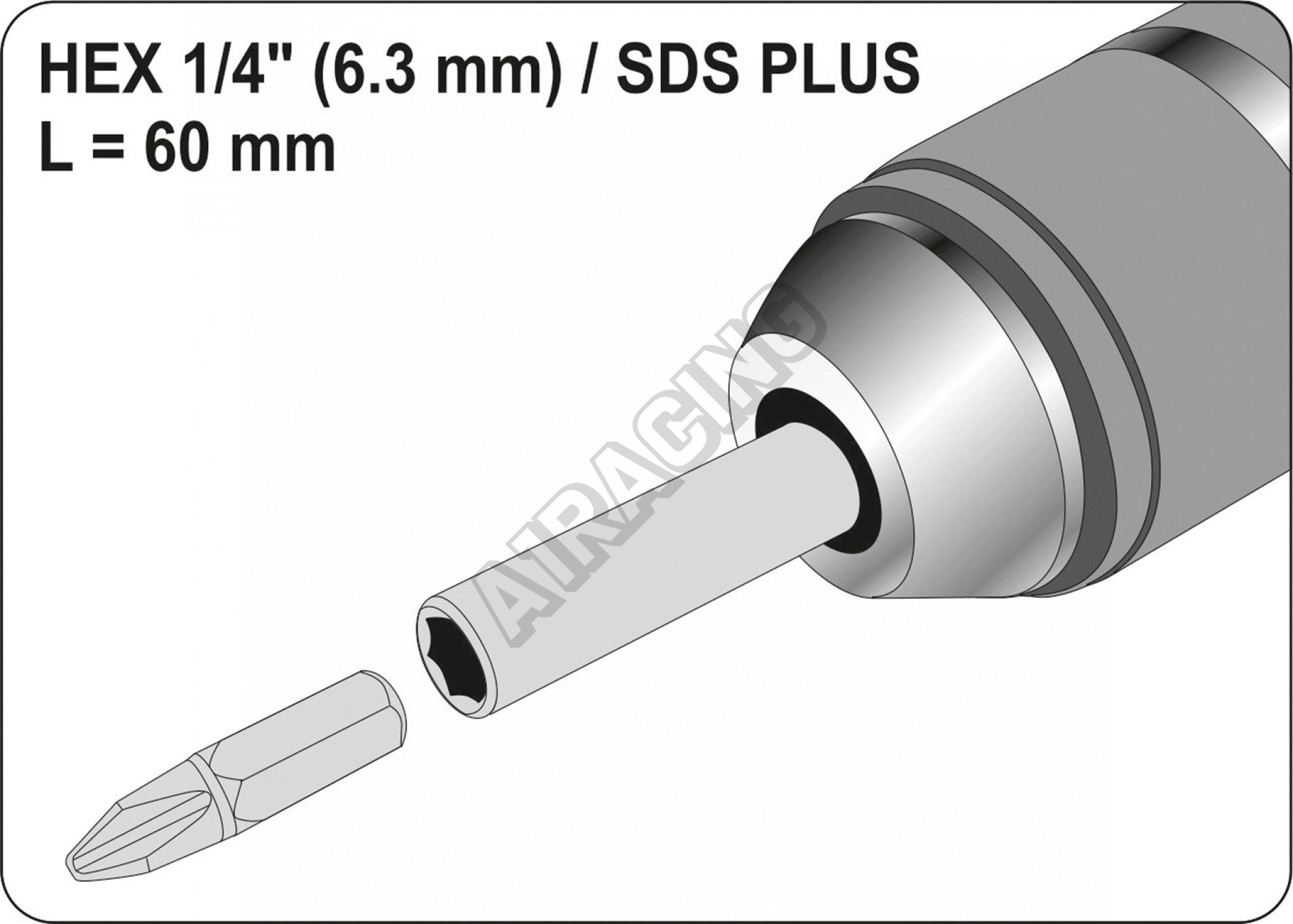 Adaptér pro vrtačky SDS-plus se zakončením HEX pro možnost nasazení bitů. Délka adaptéru je 60 mm. Z
