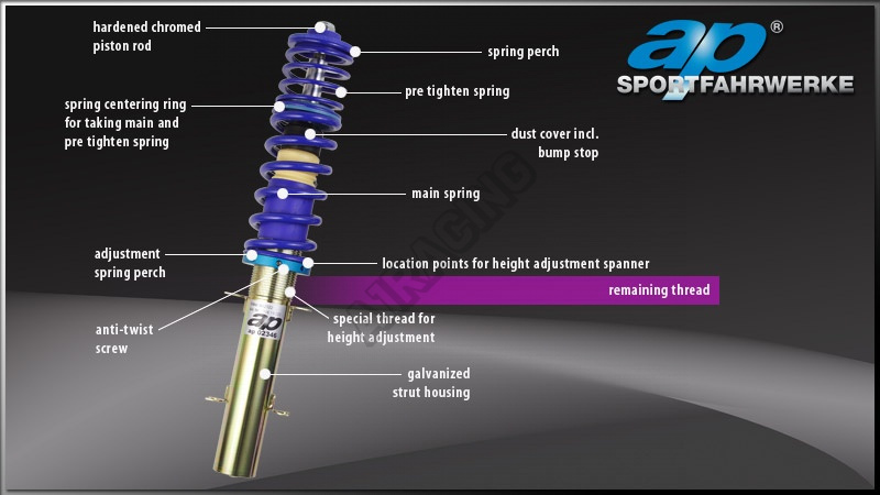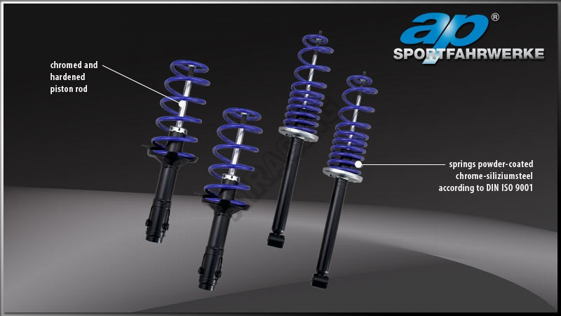 - sportovní snížené pružiny AP SPORTFAHRWERKE spadají pod německý koncern KW AUTOMOTIVE, který mimo jiné vyrábí sportovní podvozkové díly KW a WEITEC, je zde zaručena velmi dobrá kvalita i funkčnost, AP SPORTFAHRWERKE a WEITEC je určen spíše pro sportovní řidiče pro běžné ježdění, kde díky snížení a větší tvrdosti pružin je auto více stabilní, KW produkty díky tvrdšímu nastavení se hodí spíše již na závodní okruh, pokud kupujete jen pružiny, doporučené snížení je max. 35/35 mm, při větším snížení, je již opravdu lepší koupit kompletní pevný podvozek včetně zkrácených tlumičů, běžné tlumiče jíž nepracují ideálně a zkracuje se jejich životnost,