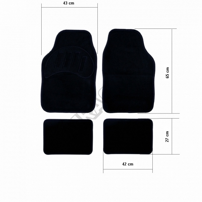 Universální textilní autokoberce.Sada 4 kusy na celé auto. Spodní část výrobku je opatřena protiskluzovou úpravou. Rozměry: přední díly 65 x 43 cm, zadní díly 27 x 42 cm.