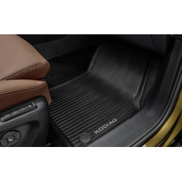 Celoroční koberce se zvýšeným okrajem jsou navrženy přesně na míru přední části podlahy ve voze Škoda Kodiaq. Optimálně vyplňují prostor pod nohama a díky prolisům, jimiž se nacvaknou na podlahové čepy, pevně drží na místě. Mají protiskluzový povrch, zachycují nečistoty a vlhkost z bot a velmi snadno se čistí. Lze je bez problému kdykoliv vyjmout a jednoduše omýt běžnými saponátovými prostředky.
