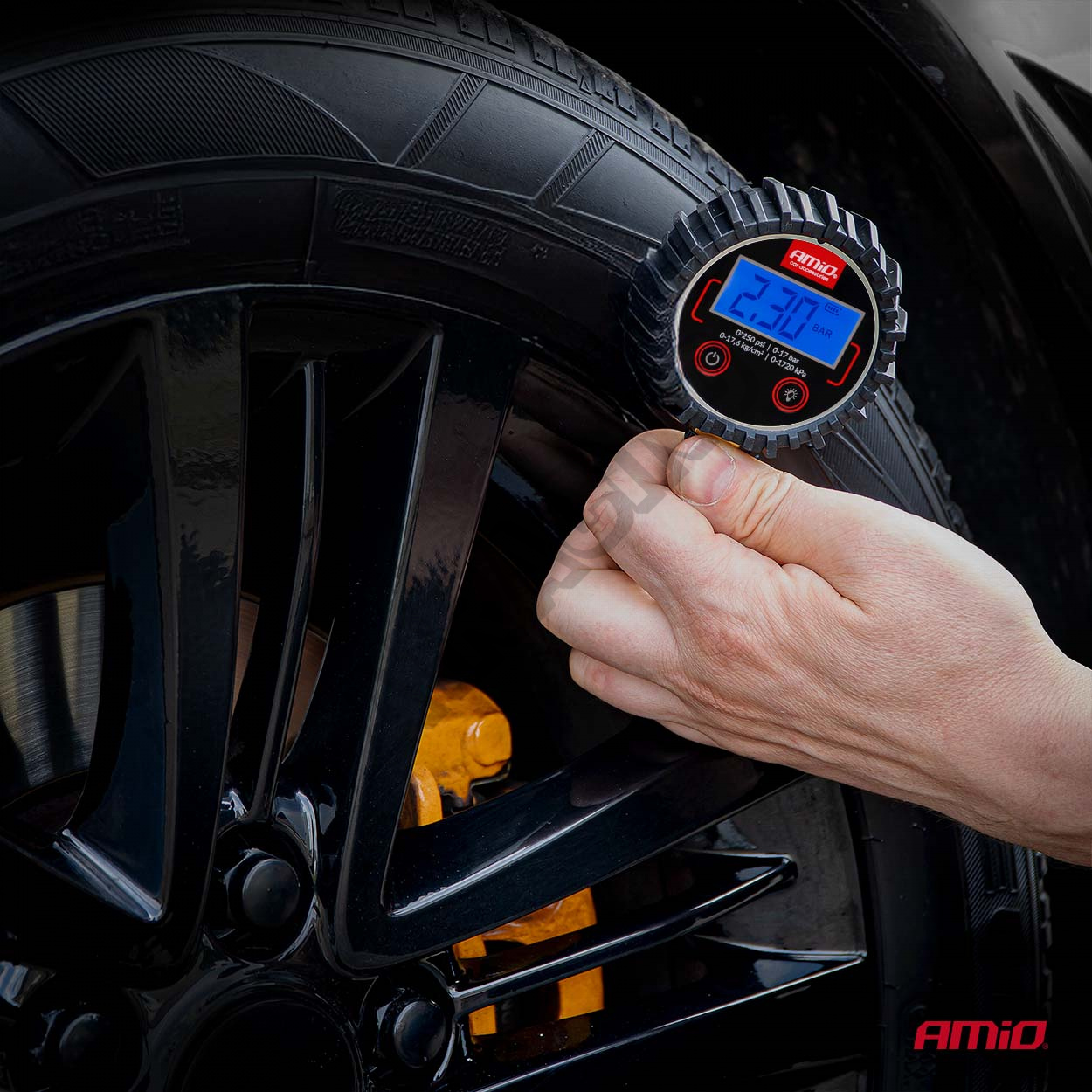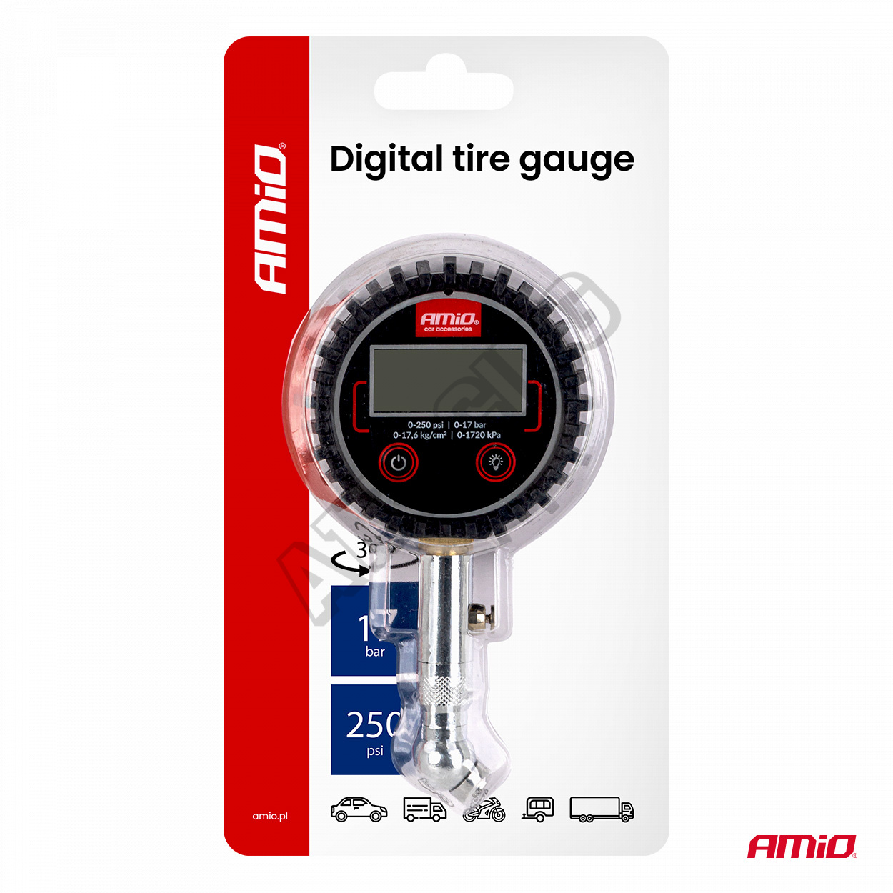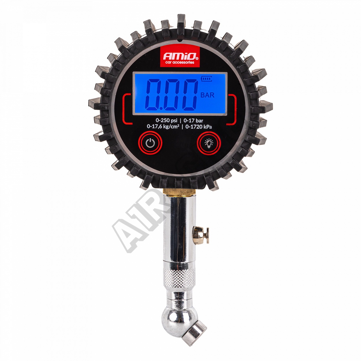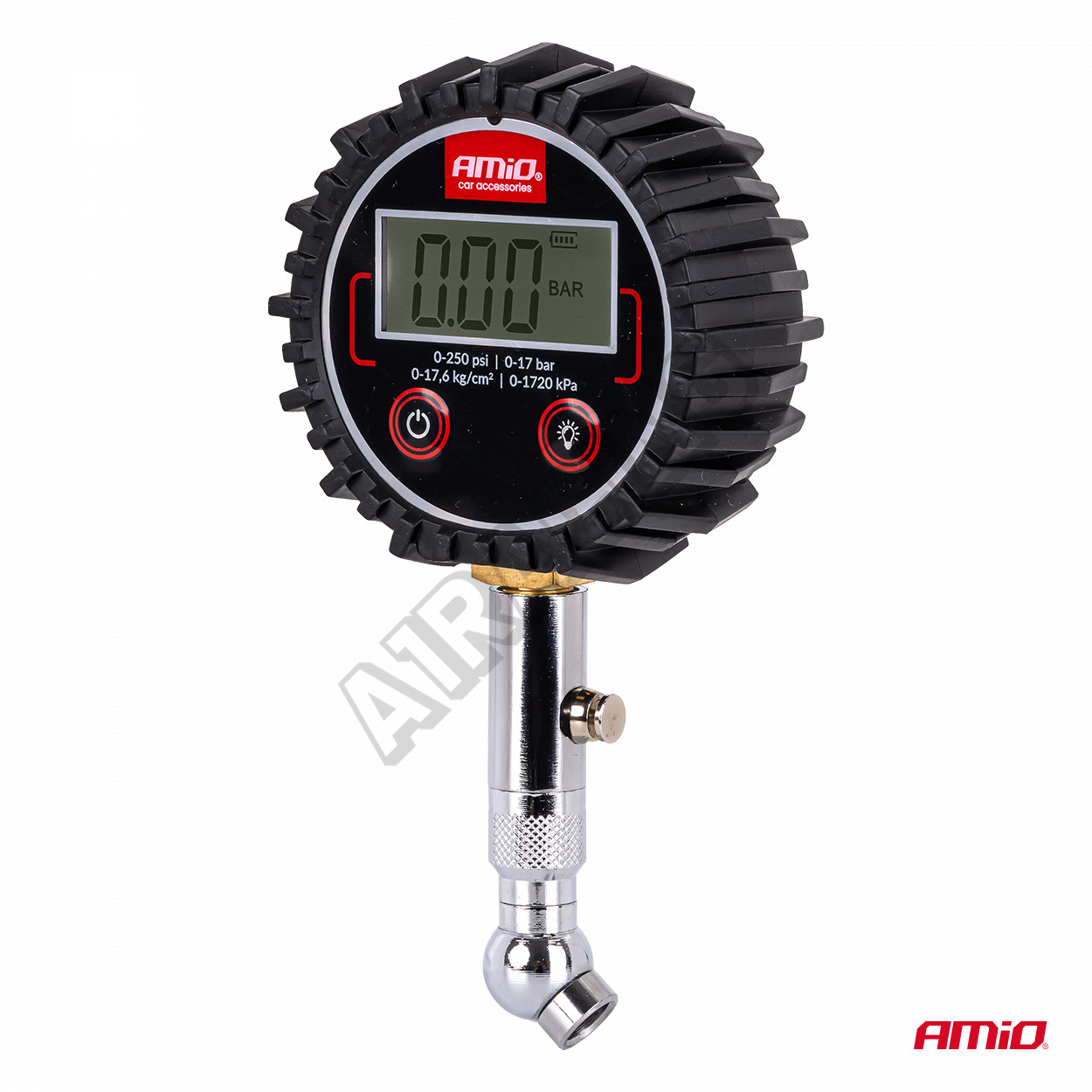 Digitálny tlakomer s otočnou hlavicou a resetovacím ventilom je profesionálny nástroj určený na kontrolu tlaku v pneumatikách. Vybavený digitálnym displejom zaručuje presné a rýchle merania do 17 barov. Pohyblivá hlavica umožňuje pohodlný prístup k ventilom na ťažko dostupných miestach a výpustný ventil umožňuje ľahko upraviť tlak bez nutnosti zloženia prístroja.