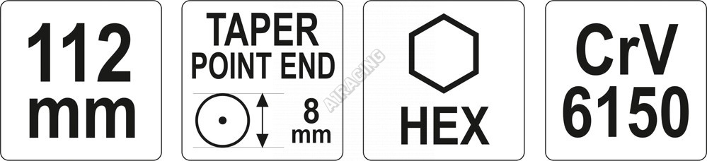 Celková délka důlčíku je 112 mm. Hrot je naostřen pod úhlem 90° o průměru 8 mm. Vyrobeno z oceli CrV