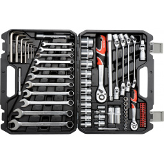 Gola sada 1/2", 1/4" obsahuje 77ks: nástavců, prodlužovacích nástavců, ráčny s plastovou rukojetí a 72 zubým jemným chodem, kloubové nástavce, očkoploché klíče, imbusové klíče a další příslušenství. Vyrobené z kvalitní chromvanadiové oceli CrMo440, CrV6150 a CrV50BV30, S2 s funkcí AS-DRIVE.