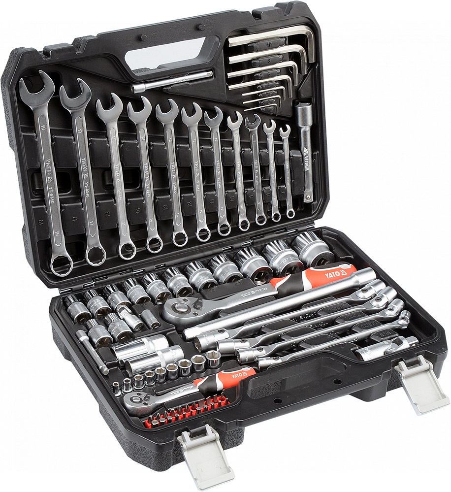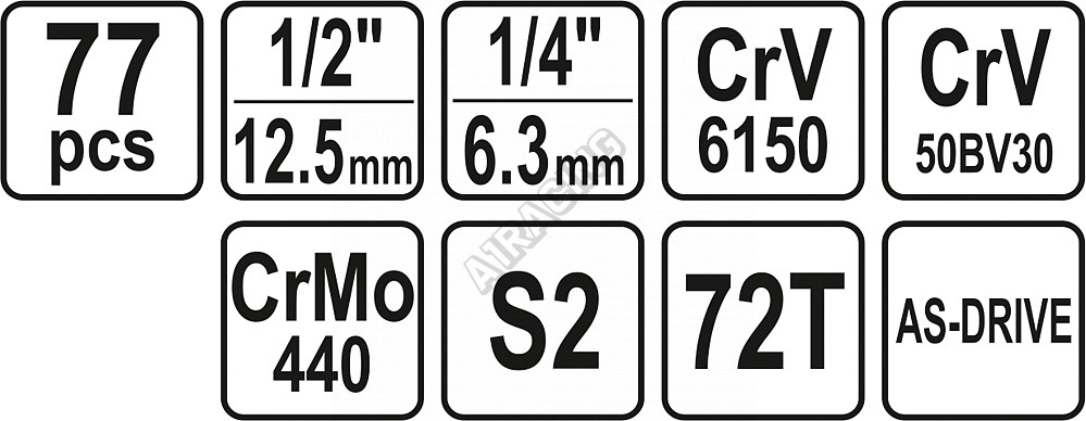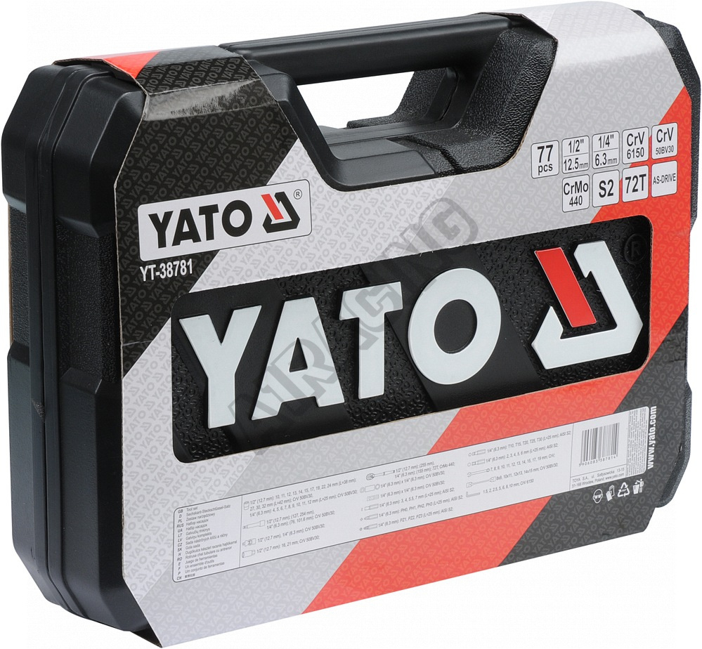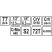 Gola sada 1/2", 1/4" obsahuje 77ks: nástavců, prodlužovacích nástavců, ráčny s plastovou rukojetí a 72 zubým jemným chodem, kloubové nástavce, očkoploché klíče, imbusové klíče a další příslušenství. Vyrobené z kvalitní chromvanadiové oceli CrMo440, CrV6150 a CrV50BV30, S2 s funkcí AS-DRIVE.