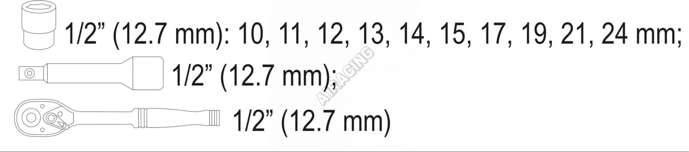 - 10x nadstavec 1/2": 10; 11; 12; 13; 14; 15; 17; 19; 21; 24 mm