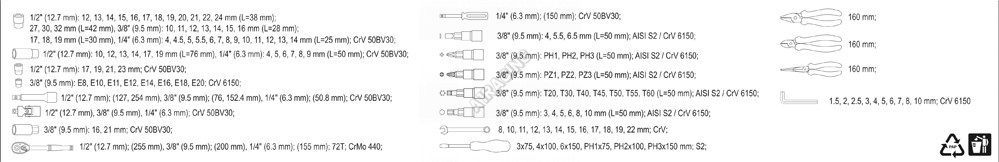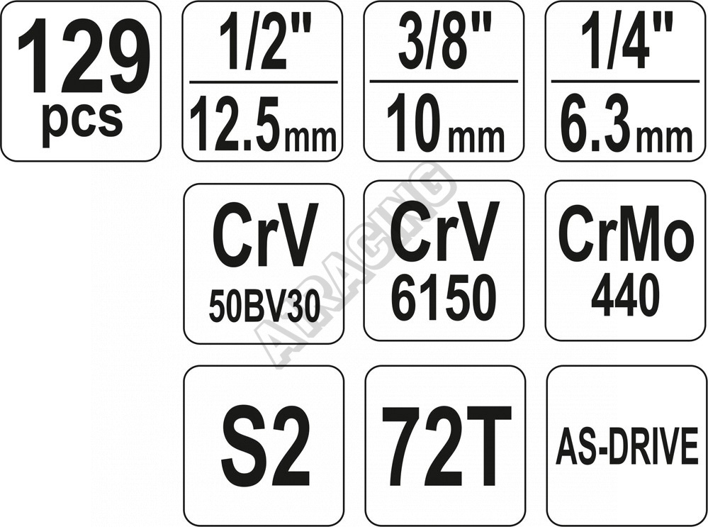 Gola sada 1/2", 3/8", 1/4" obsahuje 129ks: nástavců, prodlužovacích nástavců, ráčny s plastovou rukojetí a 72 zubým jemným chodem, kloubové nástavce, očkoploché klíče a další příslušenství. Vyrobené z kvalitní chromvanadiové oceli CrMo440, CrV6140 a CrV50BV30, S2 s funkcí AS-DRIVE.