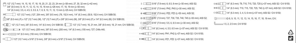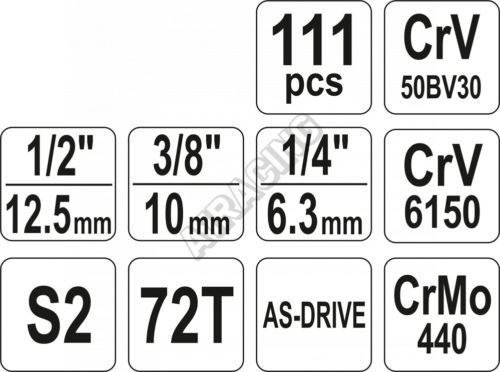 Gola sada 1/2", 3/8", 1/4" obsahuje 111ks: metrických a S.A.E. nástavců, prodlužovacích nástavců, ráčny s plastovou rukojetí a 72 zubým jemným chodem, kloubové nástavce, očkoploché klíče, nástavce s nejběžněji používanými bity a další příslušenství. Vyrobené z kvalitní chromvanadiové oceli CrMo440, CrV6150 a CrV50BV30, S2 s funkcí AS-DRIVE.
