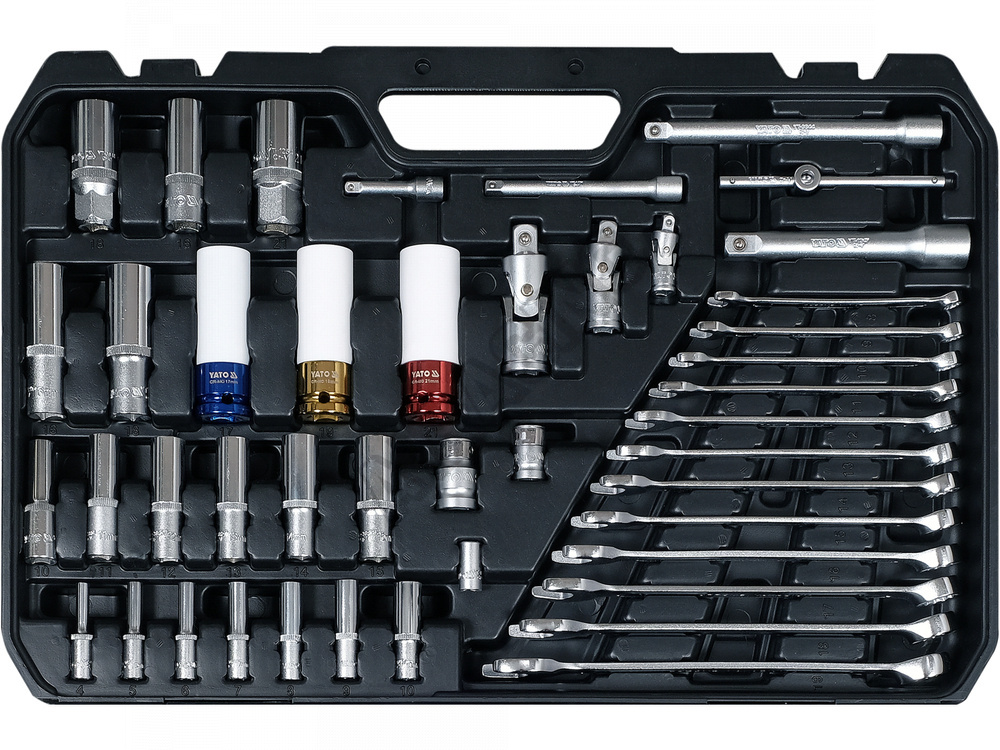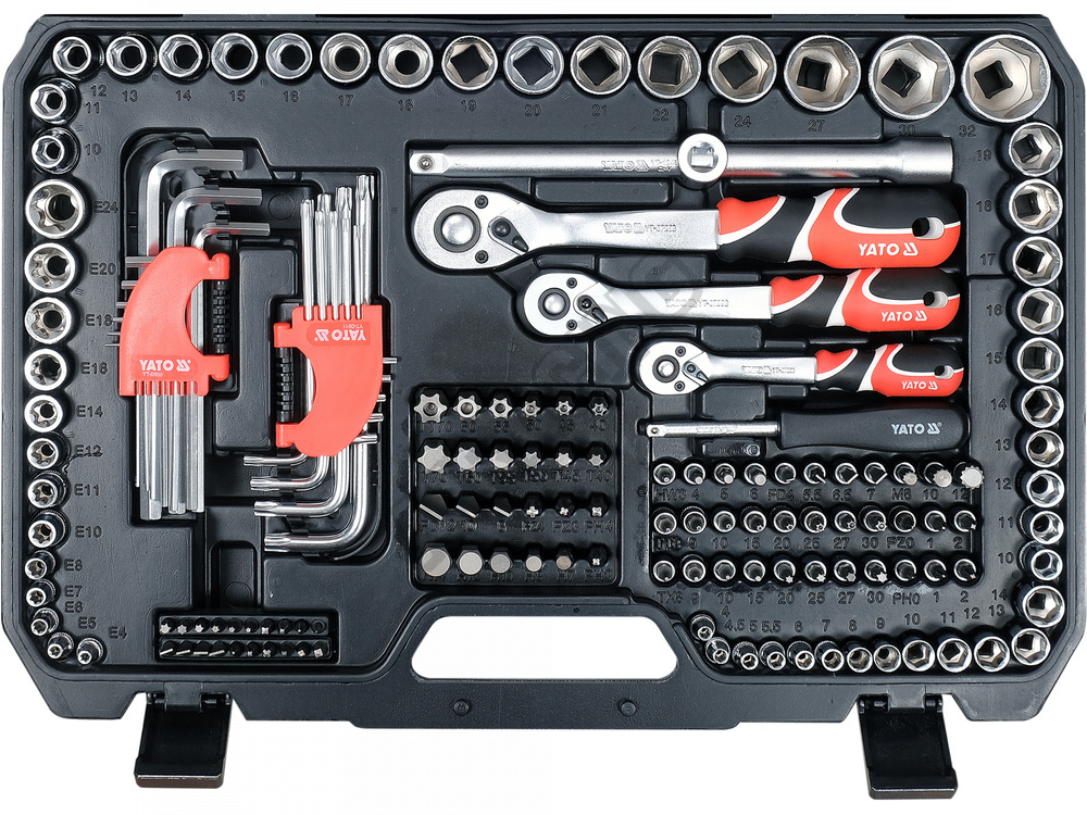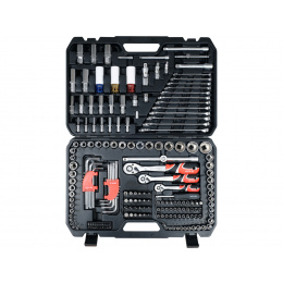 Gola sada 1/2", 3/8", 1/4" obsahuje 120ks: metrických a S.A.E. nástavců, prodlužovacích nástavců, ráčny s plastovou rukojetí a 72 zubým jemným chodem, kloubové nástavce, očkoploché klíče, nástavce s nejběžněji používanými bity a další příslušenství. Vyrobené z kvalitní chromvanadiové oceli CrMo440, CrV6150 a CrV50BV30, S2 s funkcí AS-DRIVE.