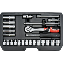 Gola sada 1/4" obsahuje 25ks: nástavců, prodlužovacích nástavců, ráčnu s plastovou rukojetí a další