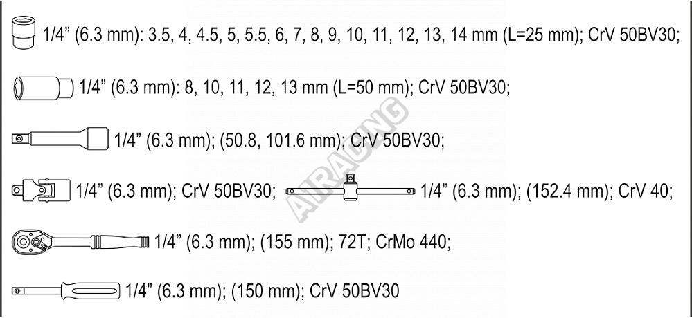 | 14x | nástavec 1/4": 3,5; 4; 4,5; 5; 5,5; 6; 7; 8; 9; 10; 11; 12; 13; 14 mm (25 mm) |