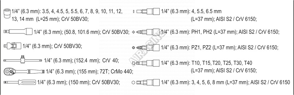 | 14x | nástavec 1/4": 3,5; 4; 4,5; 5; 5,5; 6; 7; 8; 9; 10; 11; 12; 13; 14 mm (25 mm) |