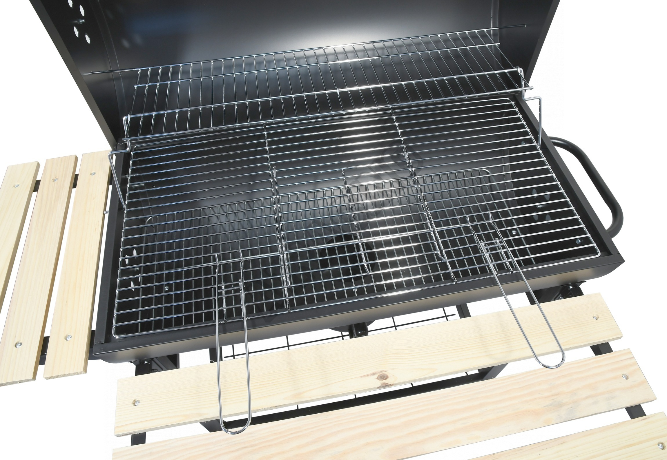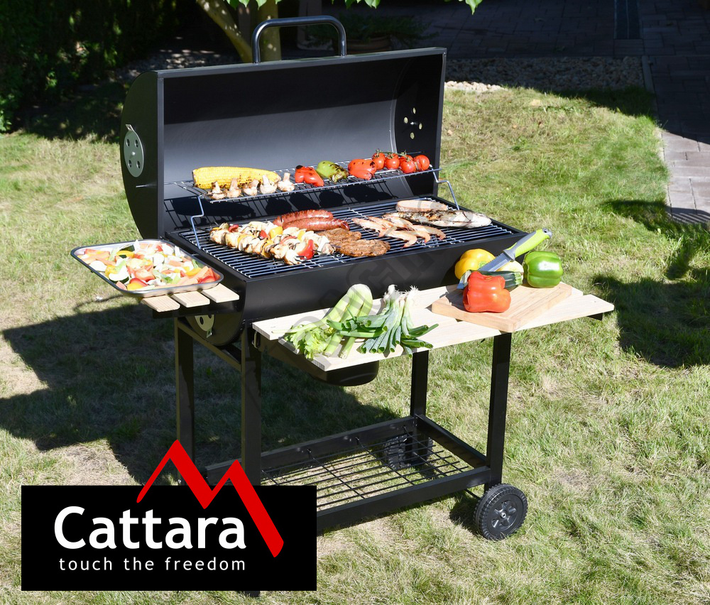 Velký zahradní gril na dřevěné uhlí s rozměrnou grilovací plochou a celou řadou odkládacích prostor.