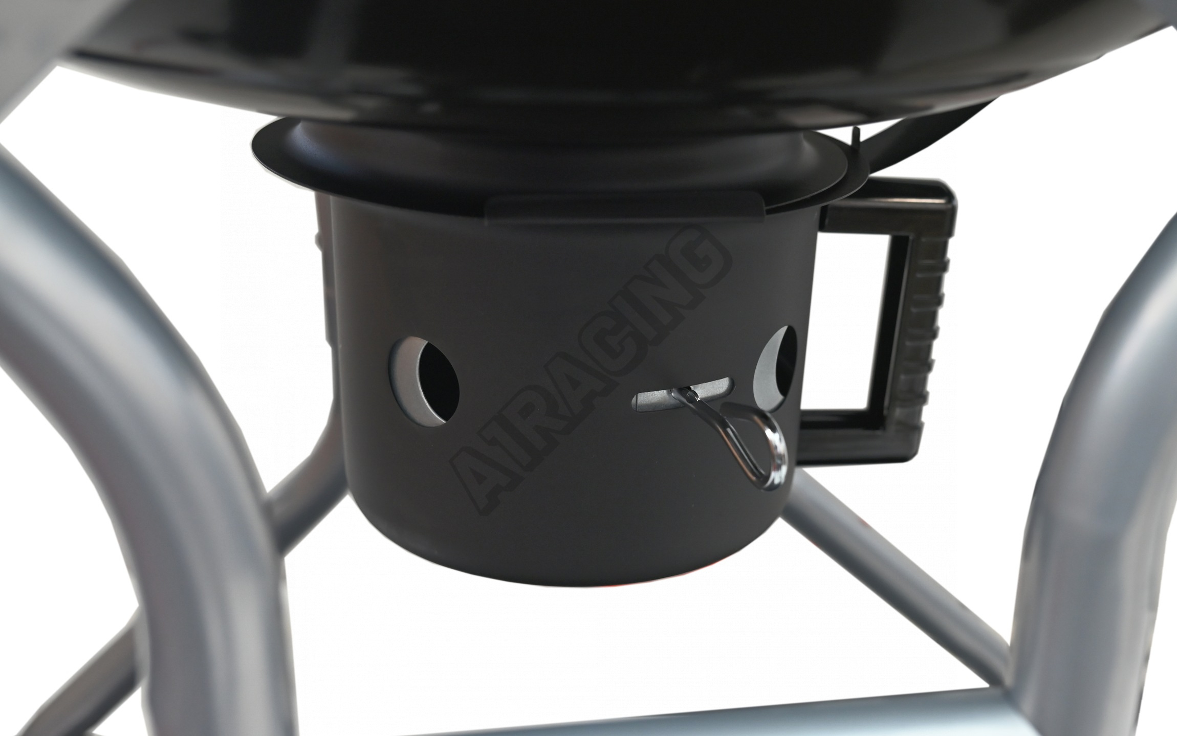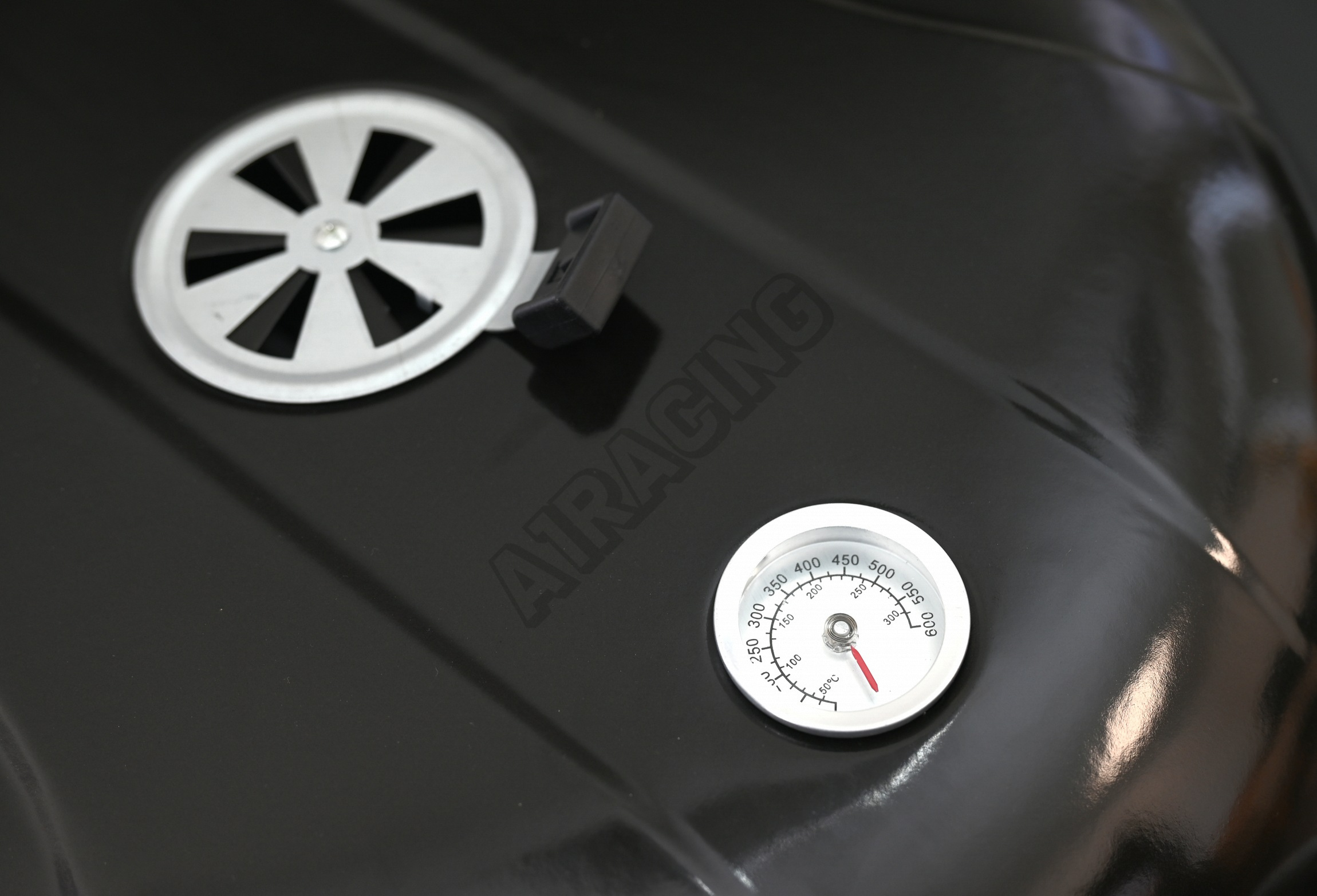 Vyklápěcí víko je tvarováno z nerezové oceli se smaltovaným povrchem, je opatřené teploměrem a regulací ventilace. Madlo na víku je plastové a má dostatečný prostor pro úchop. Ve spodní části je grilovací prostor opatřen vysouvacím popelníkem s nastavitelným prouděním vzduchu.