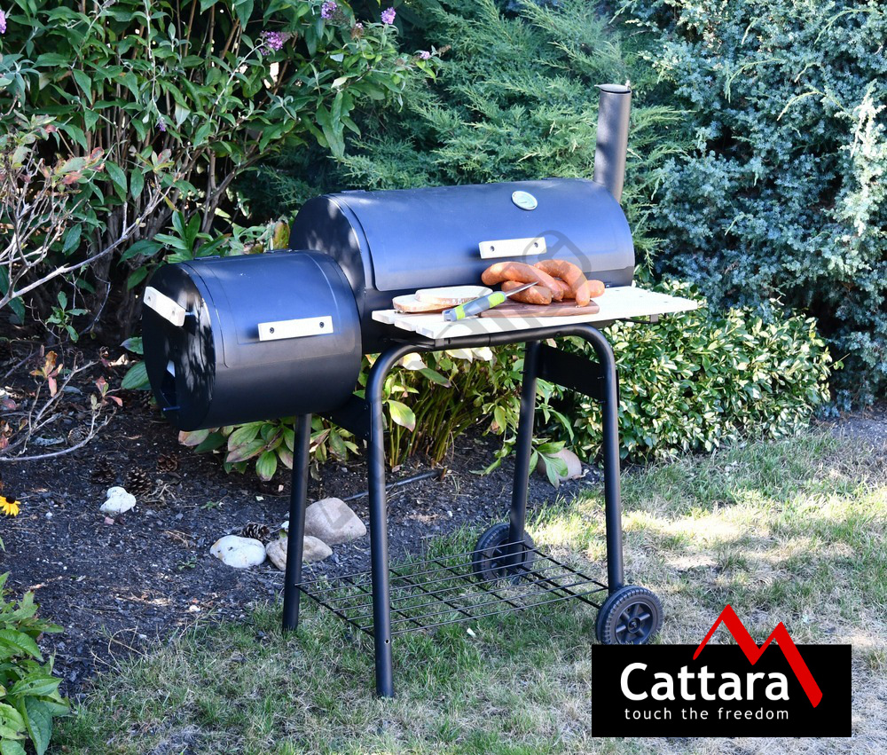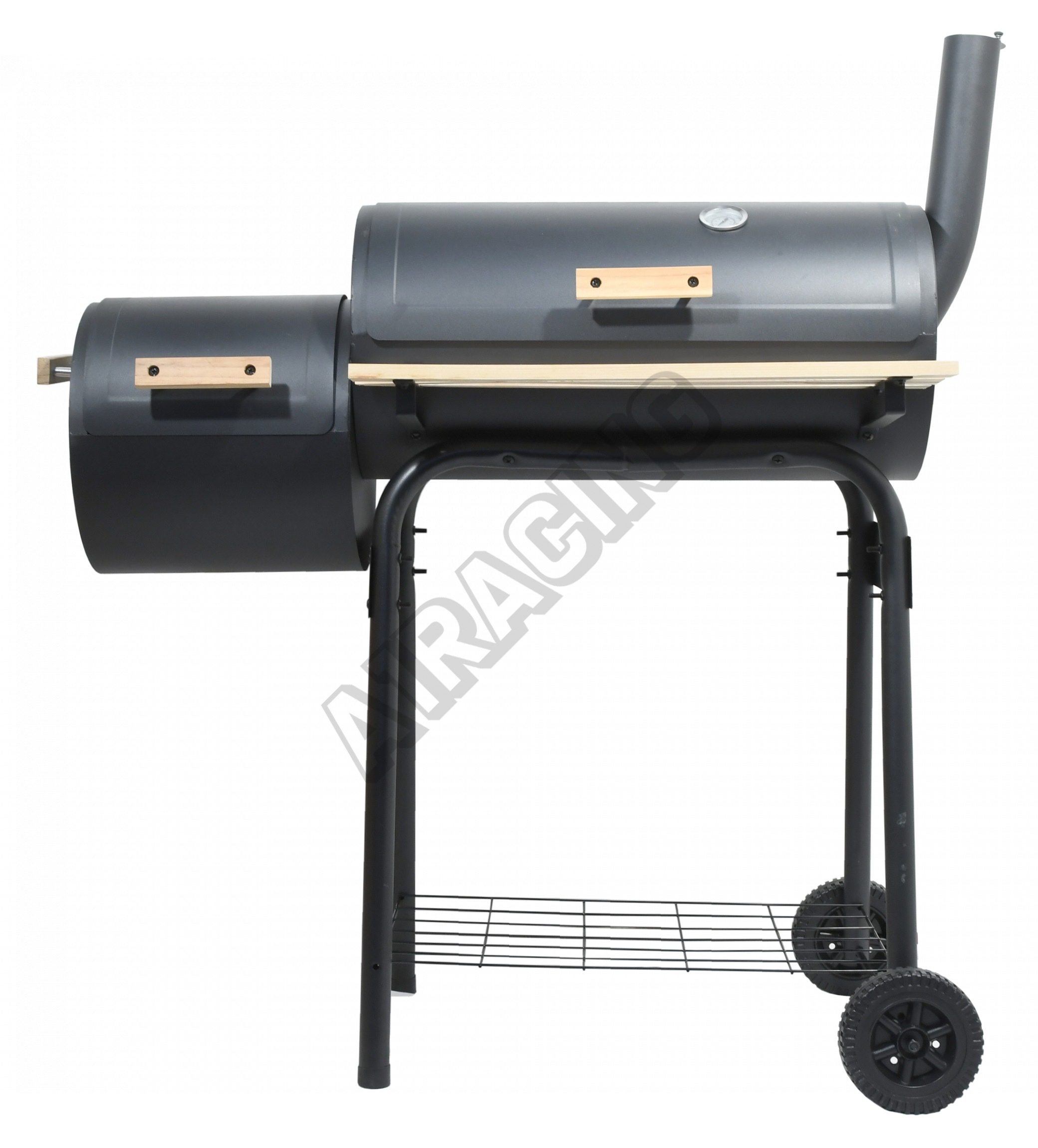 Zahradní gril s udírnou, na dřevěné uhlí s konstrukcí typu lokomotiva. Gril je vybaven komínem s uza