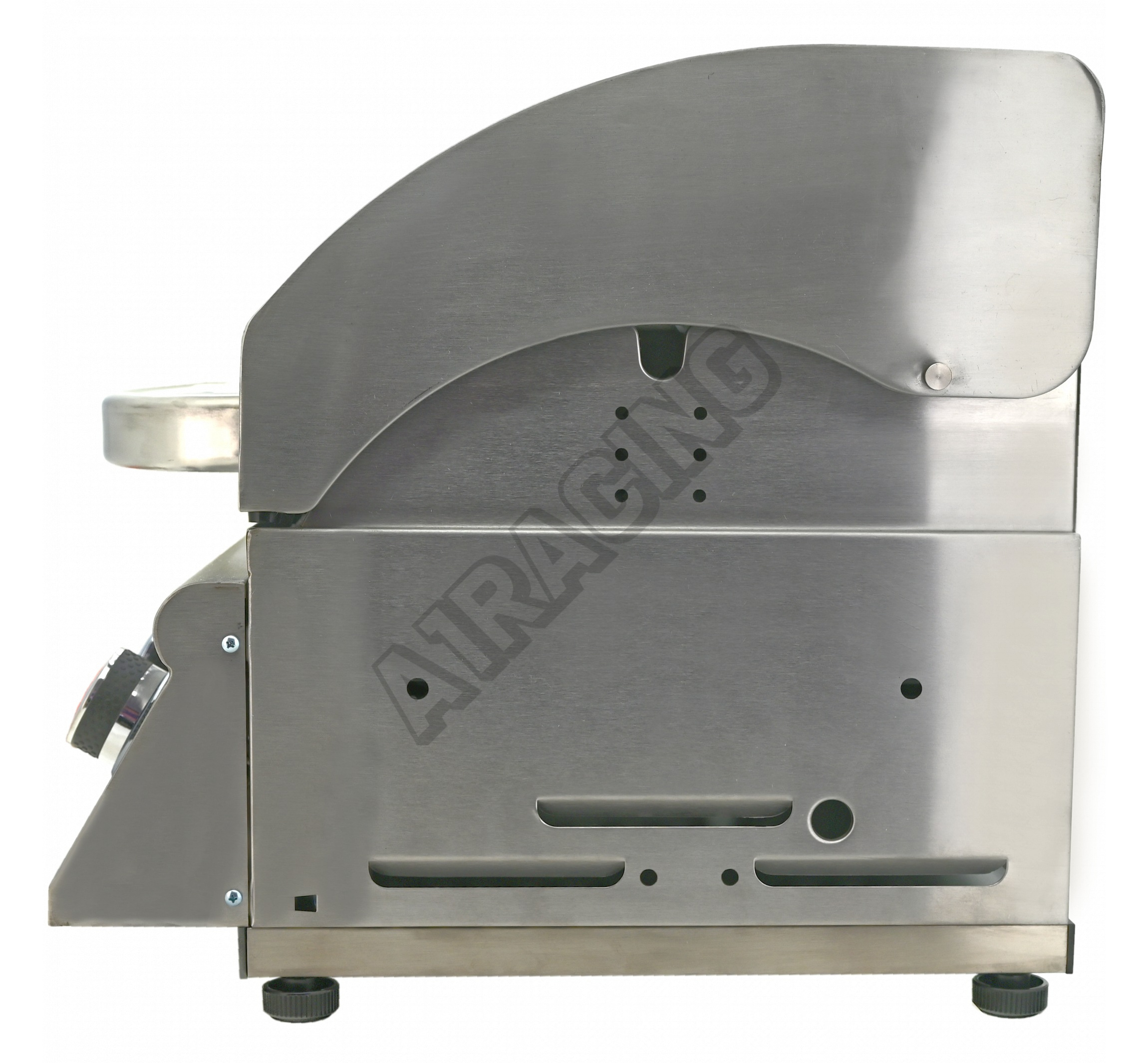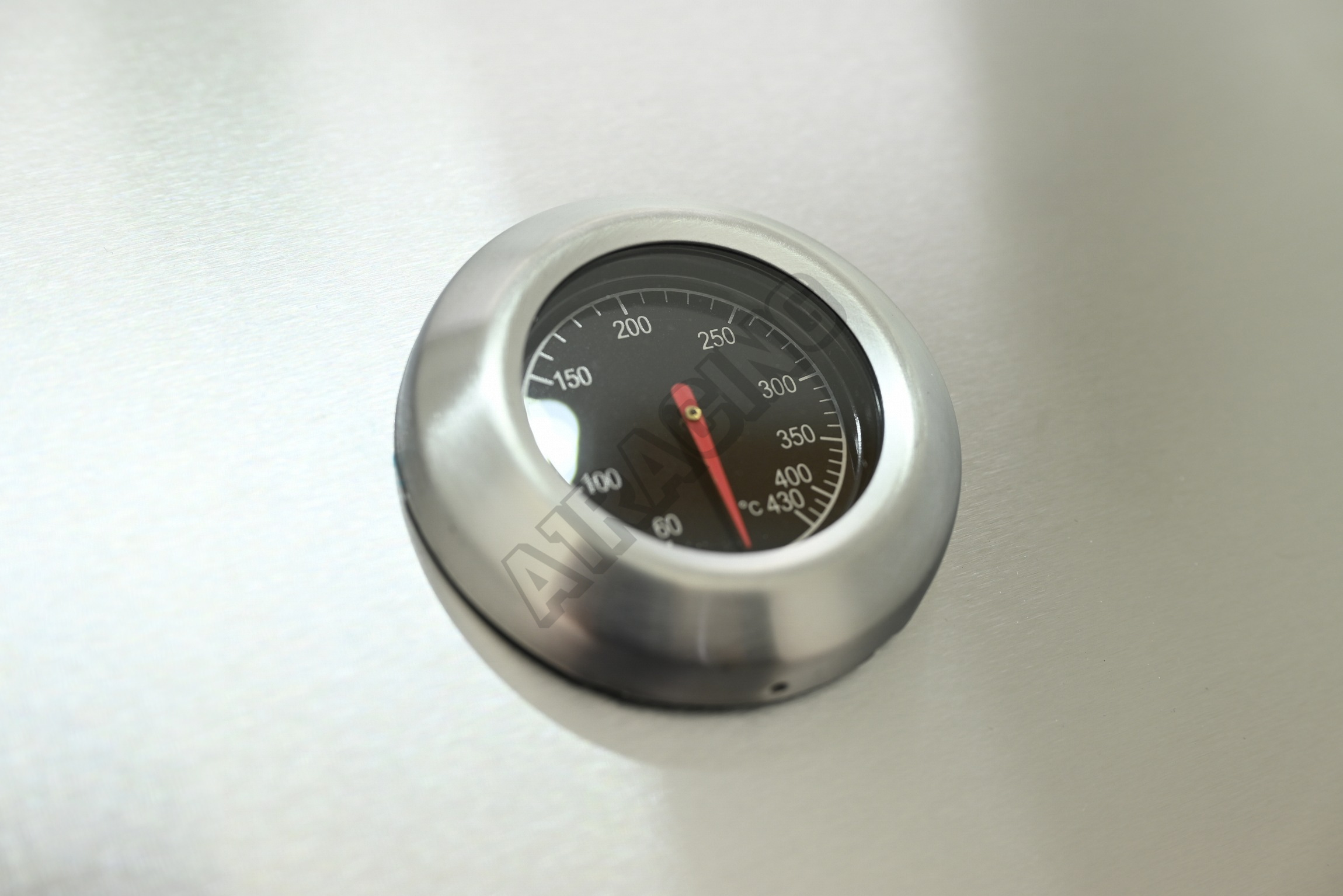 Konstrukce z nerezové oceli dodá grilu brilantní vzhled a vysokou odolnost. Vyklápěcí víko je opatřeno teploměrem a mohutným madlem pro snadnou manipulaci. Pro snadnou údržbu je zadní strana grilu opatřena poličkou po celé ploše grilu, určenou pro zachytávání odkapávajícího tuku. Na spodní straně je gril doplněn nožičkami s nastavitelnou výškou, pro vyrovnání grilu.