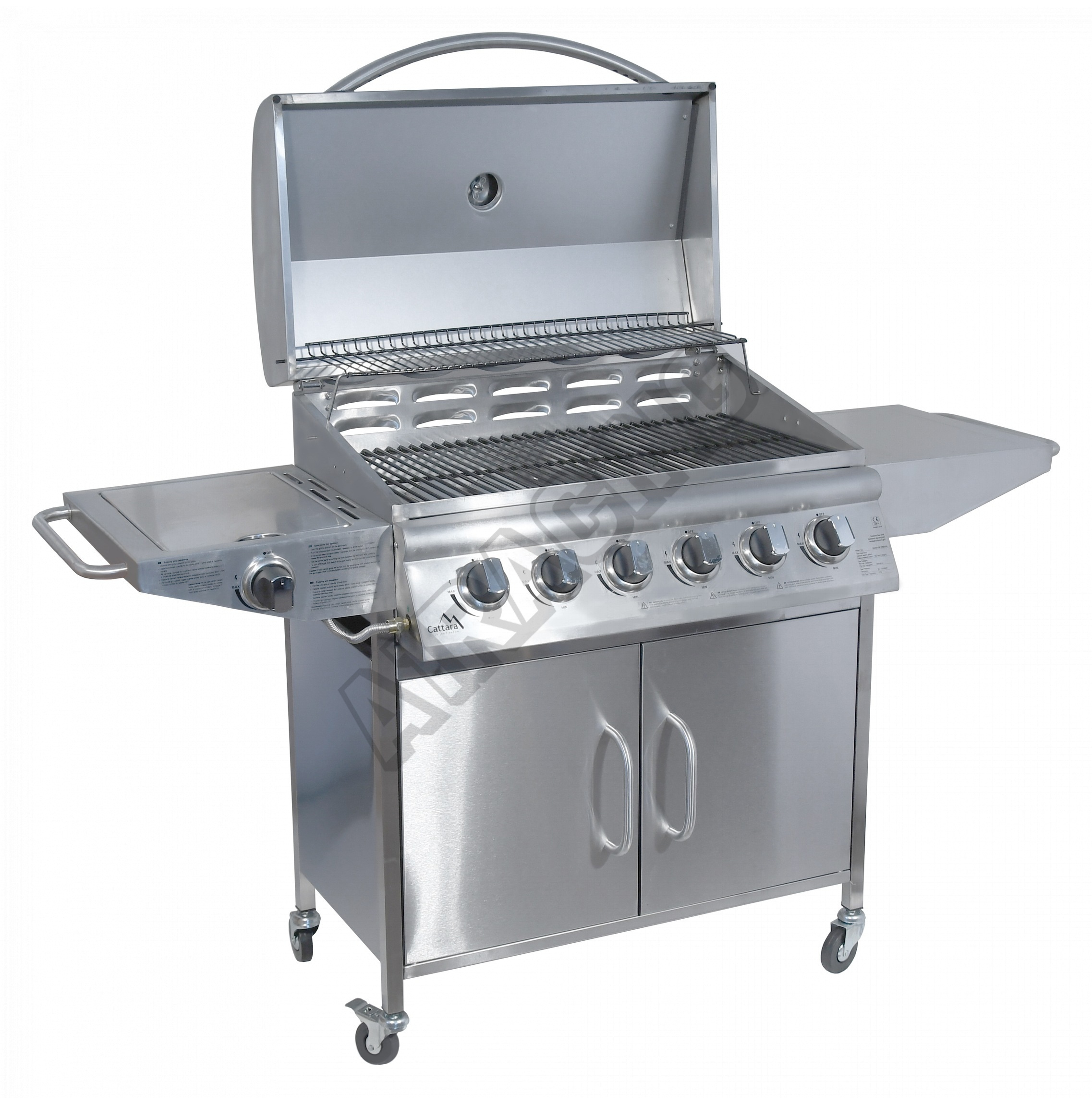 Plynový zahradní gril se systémem Flame Tamer. Hlavní grilovací prostor je osazen 6x hořáky se samostatnou regulací a piezo zapalováním. Díky možnosti vypnout prostřední hořáky je gril vhodný jak pro přímé, tak pro nepřímé grilování a je vybaven odkládacím roštem pro udržování teplot již hotových pokrmů.