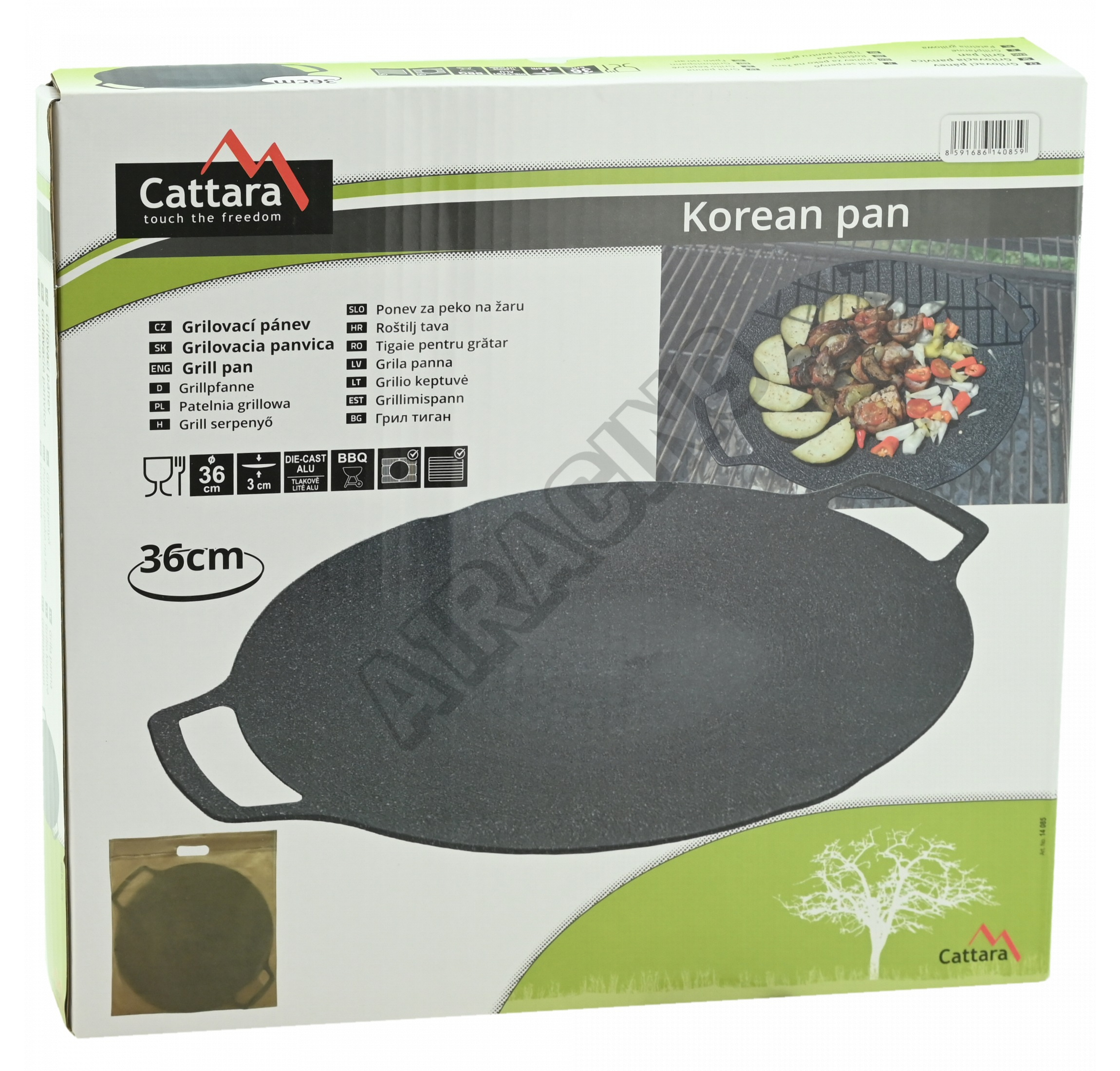 Korejská grilovací pánev z tlakově litého hliníku o průměru 36 cm.Pánev nabízí dostatek prostoru pro