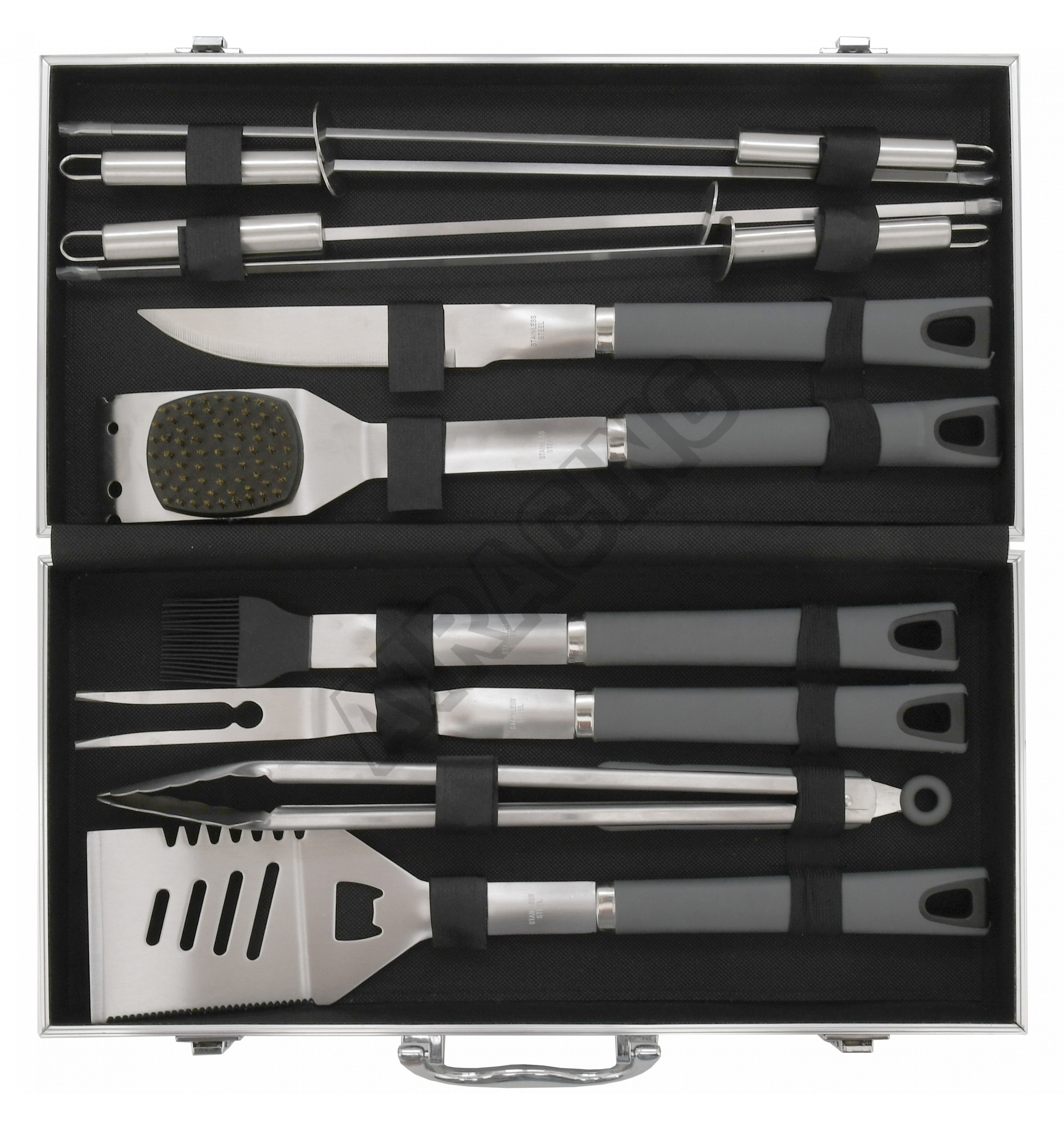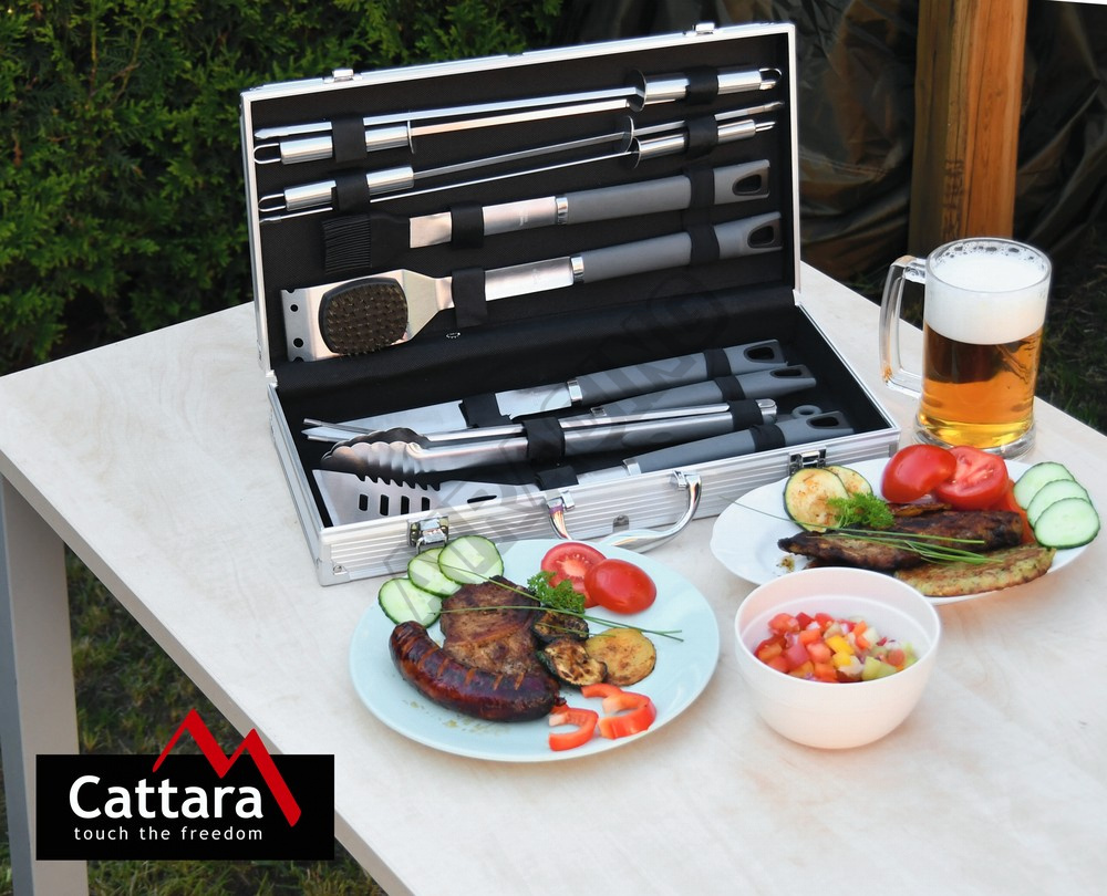 V sadě se nachází obracečka s precizně zabroušenou hranou vybavená zoubkovaným ostřím, otvírákem zátek a otvory pro odtok. Kleště, speciálně tvarované pro jistý úchop nejrůznějších pokrmů, kartáč pro údržbu grilu, kdy samotná kartáčová část je z mosazi. Nepostradatelnou částí grilovcího nářadí je i dvouzubá vidlička, štětec se štětinami z nylonu, pro potírání, či mašlování pokrmů, porcovací nůž a 4x grilovací jehlice s hroty broušenými do špičky.