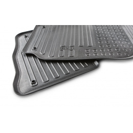 Originálne gumové koberce, presne tvarované, ľahko umývateľné. Upevnenie pomocou plastových skrutiek. Nápis Fabia.