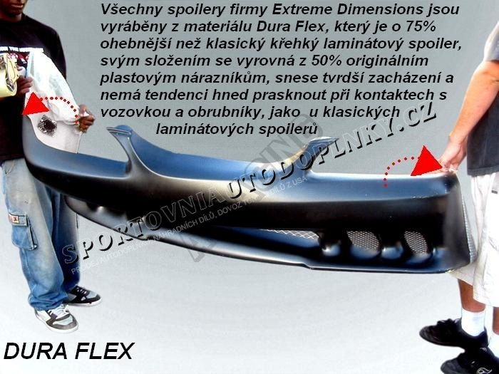 - výrobek kultovní americké firmy EXTREME DIMENSIONS, která patří mezi absolutní špičku ve výrobě spoilerů na americké scéně, všechny spoilery jsou vyráběny technologii DURA FLEX, jedná se o materál, který svoji tvárností a pružností se až z poloviny vyrovná klasickému plastu jako u originálních nárazníků, je až o 75% odolnější proti nárazu a ohybu než klasické křehké laminátové spoilery viz demontrativní obrázek v galerii, povrchová úprava přední strany spoileru je v černé gelové barvě, dále je možno zakoupit produkty této firmy i v karbon provedení,
