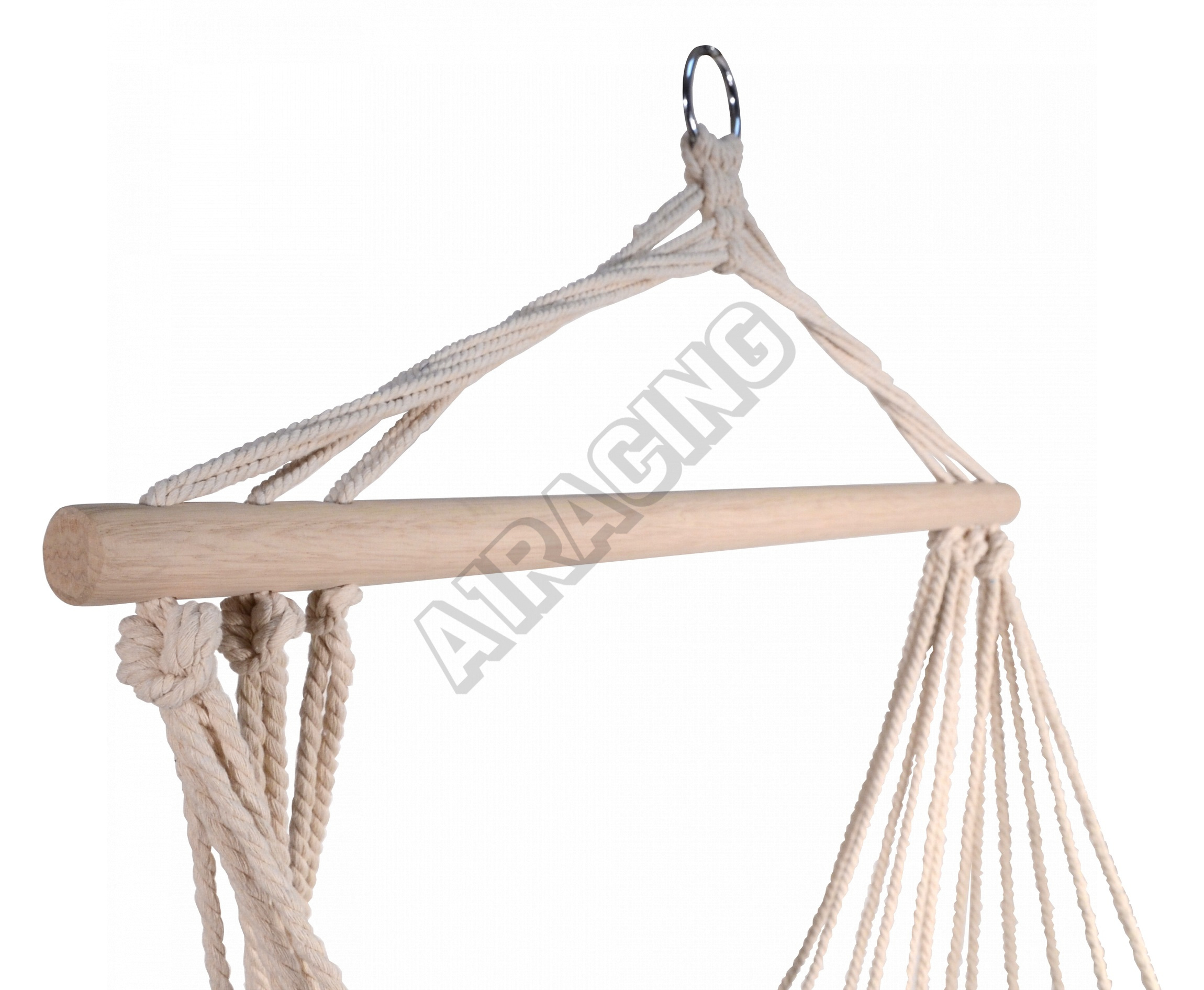 Provazy jsou protaženy dřevěnou tyčí zabezpečujíce stabilitu a jednotlivá 5 mm vlákna jsou na konci zapletena do závěsného kroužku.