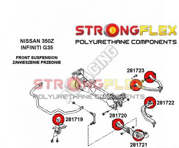 Infinity G35 2003-07 StrongFlex (tvrdost 80ShA) kompletní sestava silentbloků na celé auto obsahuje :