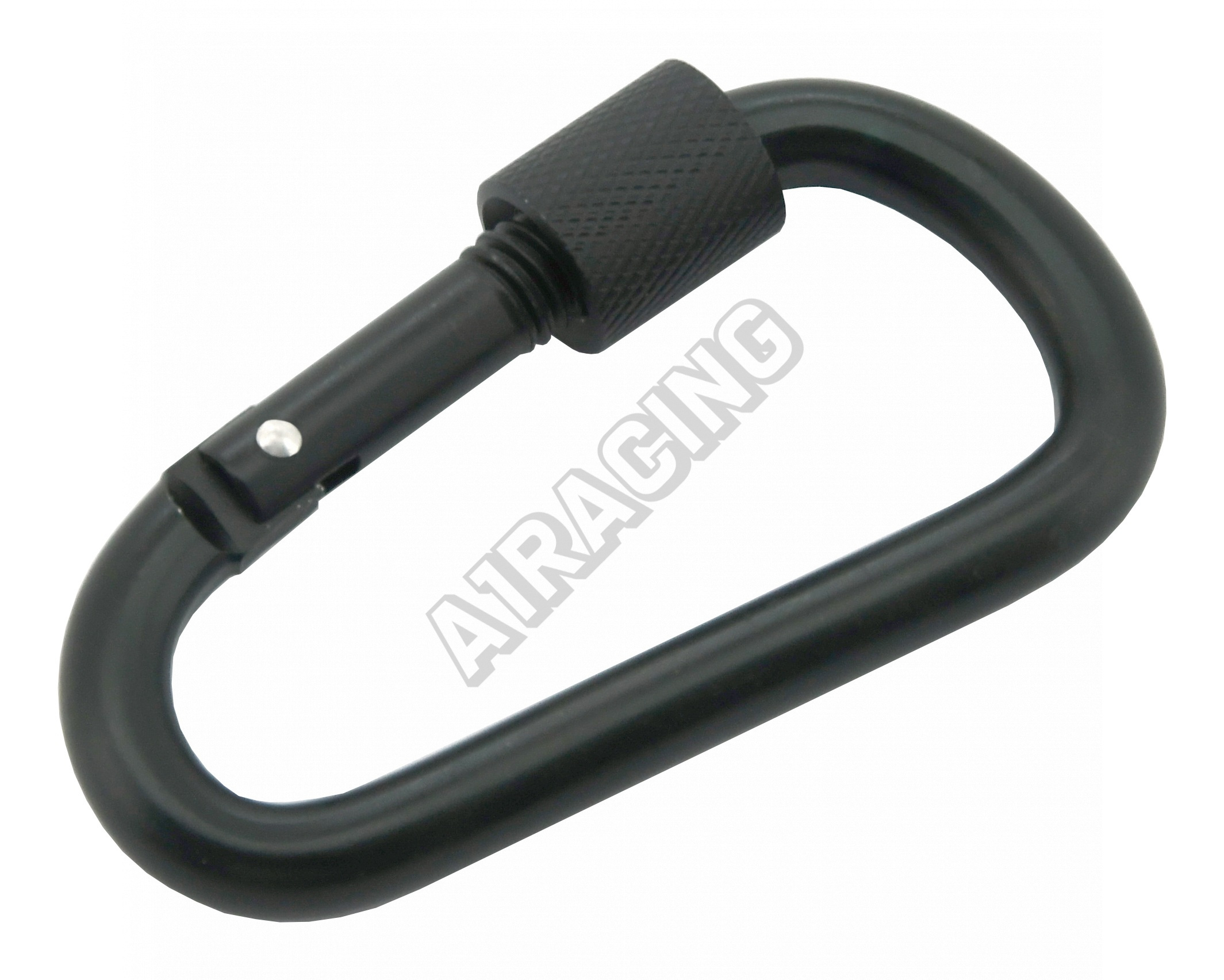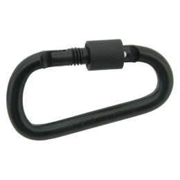 Hliníková karabina opatřená šroubovací, převlečnou pojistkou, pro zamezení nechtěnného rozepnutí.