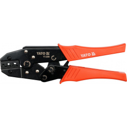 Kleště YT-2300 pro krimpování izolovaných konektorů, se zčernalým povrchem, který chrání před korozí, a s plastovými kryty rukojetí. Rohatkový mechanismus umožňuje rychlé a přesné upnutí bez použití nadměrné síly.