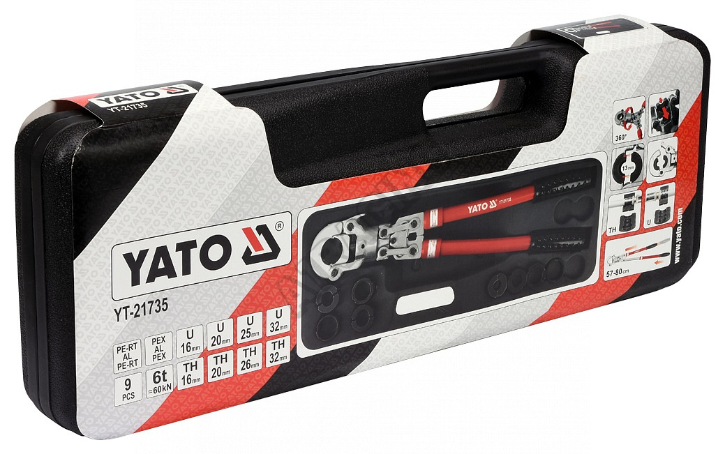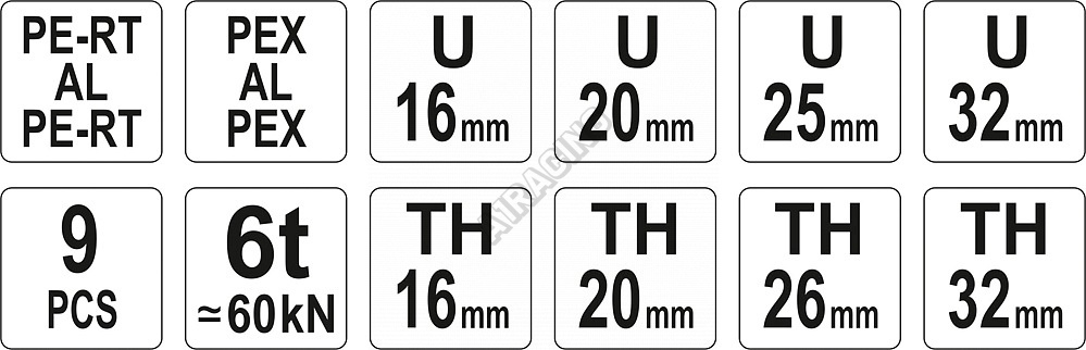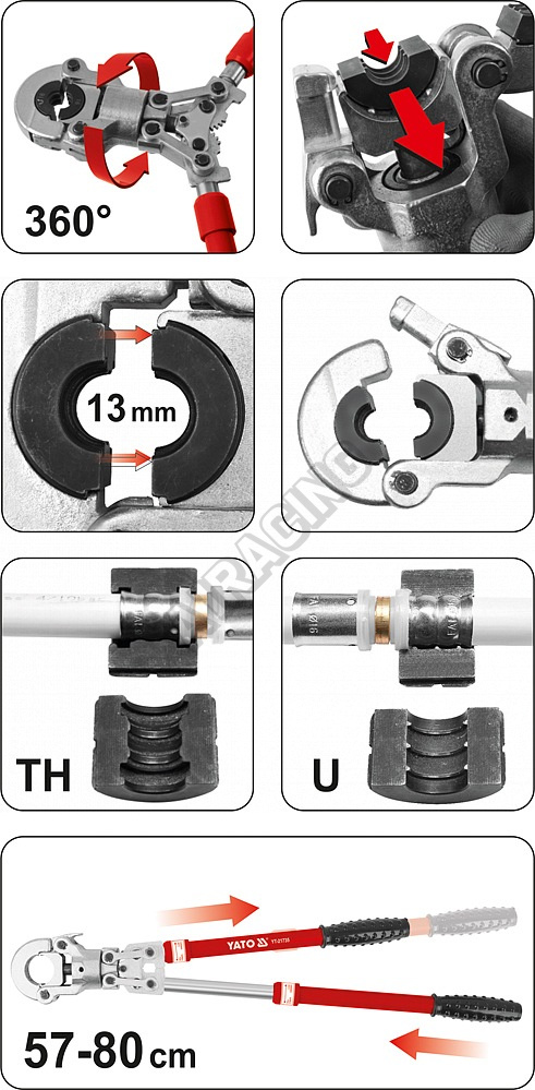 Lisovací kleště na plastové vodovodní potrubí PEX-AL-PEX, PERT-AL-PERT se sadou 8 výměnných čelistí U a TH.