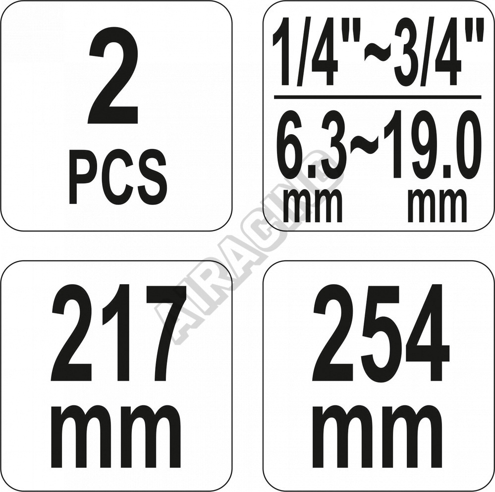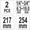 Délka kleští 217 a 254 mm, čelisti 1/4" - 3/4" (6,3 - 19 mm).