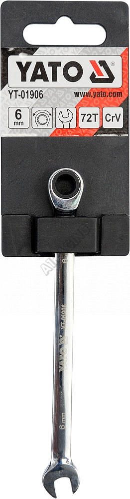 Ráčnový očkoplochý klíč Yato - na jedné straně klasický stranový klíč, na straně druhé očkový klíč s dvanáctihranným profilem vybaveným ráčnou s jemným dělením 72 zubů. Tělo klíče je vyrobeno z chromvanadiové oceli CrV6140. Povrch je vyleštěn do vysokého lesku.