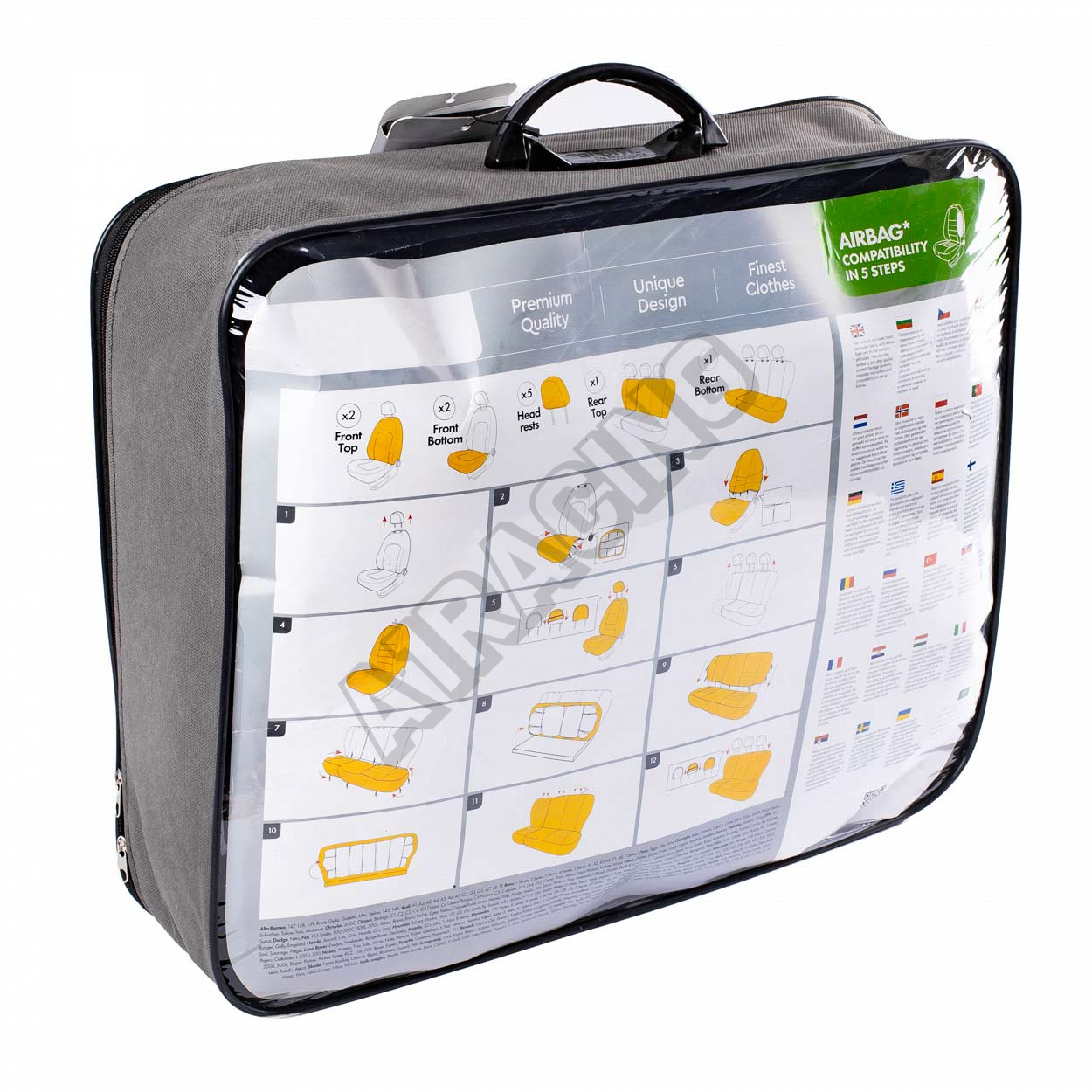 Poťahy majú zámky na zadnom sedadle, vďaka čomu pasujú na väčšinu sedadiel dostupných na trhu (nedelené pohovky, delené vpravo aj vľavo).