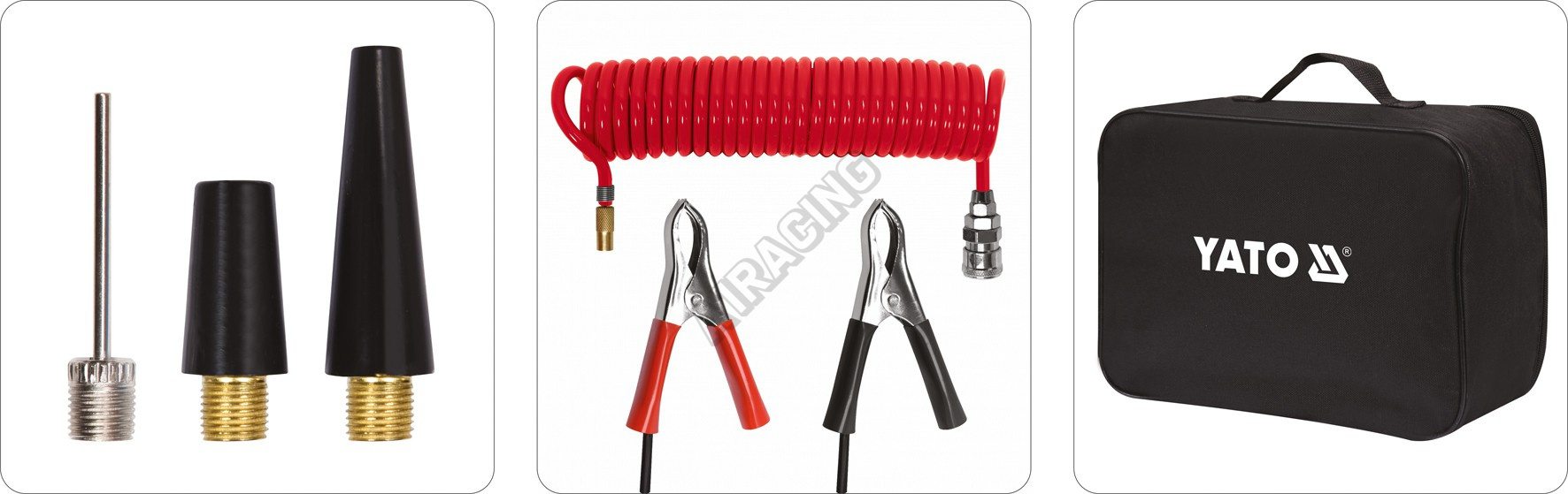 Výkonný kompresor s presným manometrom a napájaním na 12V - 13,8V. Určené na nafukovanie kolies vybavených ventilom v automobiloch, motocykloch a bicykloch a - s použitím výmenných špičiek - matrace, pontóny, lopty.
