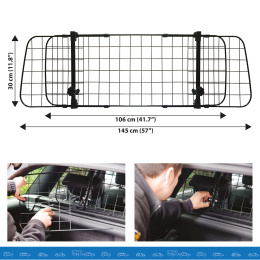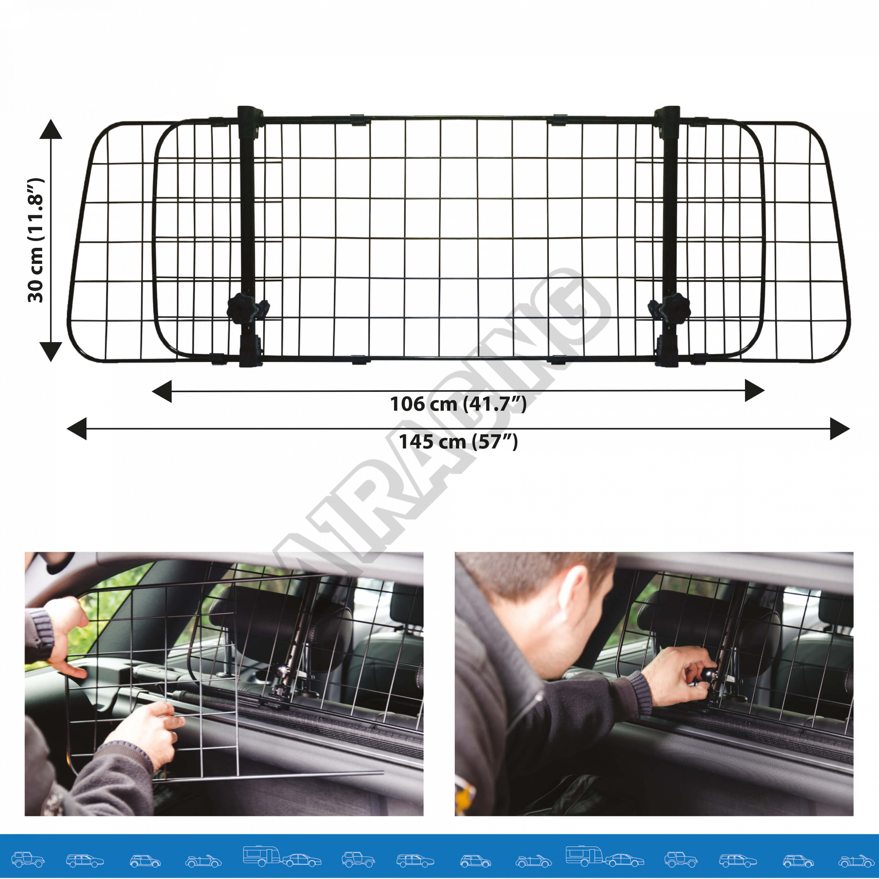 Robustná polohovateľná kovová mreža, ktorá je určená na časté prevážanie vášho maznáčika, ktorá po inštalácii sa väčšinou nedáva. Bezpečne udrží vášho domáceho maznáčika v bezpečí batožinového priestoru. Uchytenie sa vykonáva pomocou príslušenstva zobrazeného na fotke medzi sedačkou a strechou auta. Je vhodná pre väčšinu vozidiel. Bočnú mrežovanú ochranu je možné nastaviť pomocou skrutiek od seba podľa veľkosti vozidla. Výška: 30 CM. Šírka: min 106 cm max. 146cm. Vyrobené zo silných a odolných materiálov. Táto mreža je vhodná pre všetky psy až do 30 kg. Ľahko sa inštaluje a odstraňuje v priebehu niekoľkých minút.