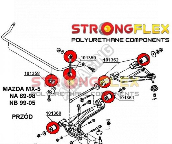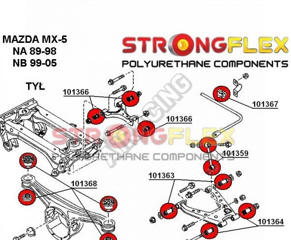Mazda MX5 1989-98 Strongflex (tvrdosť 80ShA) kompletná zostava silentblokov na celé auto obsahuje: