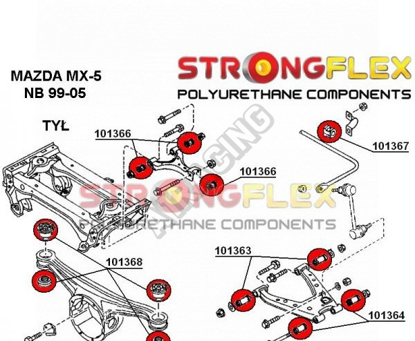 Mazda MX5 1999-05 Strongflex Sport (tvrdosť 90ShA) kompletná zostava silentblokov na celé auto obsahuje: