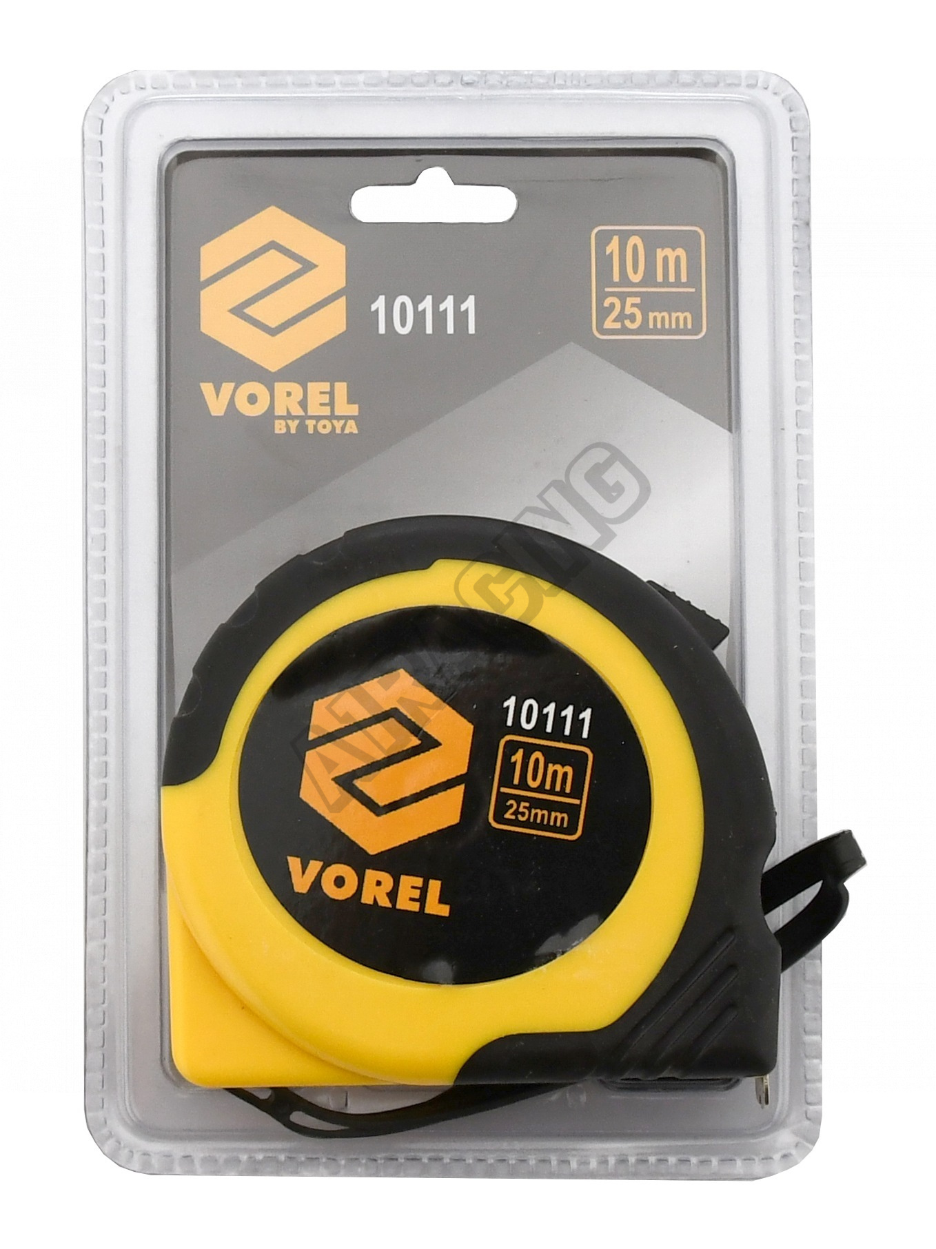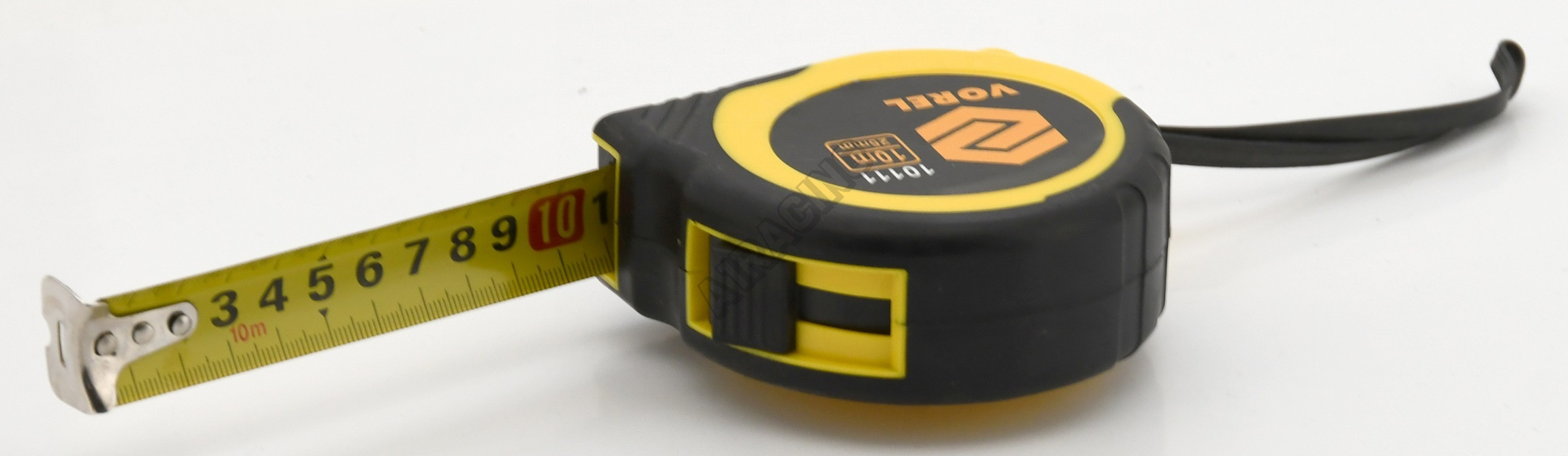 Svinovací metr 10 m dlouhý a 25 mm široký zakončený pohyblivým háčkem. Pouzdro je vyrobeno z plastu, vyztuženo gumovými podložkami a aretačním knoflíkem.