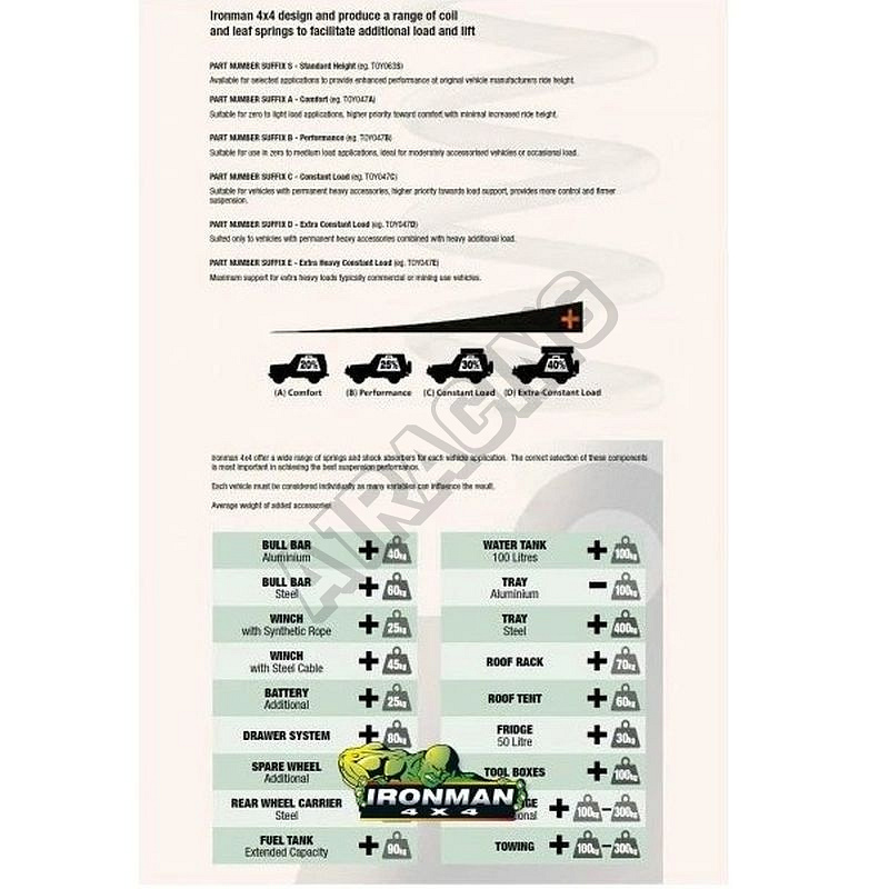 Zdvih: + 45 mm, Pridaná nosnosť: + 300++ kg. Výborné riešenie pre vozidlá, ktoré nesú konštantný, ťažký náklad. Vhodné pre vozidlá osadené ťažkými debnami s náradím. Mali by ste sa tejto verzii podvozku vyvarovať, pokiaľ na vozidle nesiete len ľahký, poprípade žiadny náklad. Všetky pružiny Ironman sú navrhnuté tak, aby zvýšili svetlú výšku vozidla nad jeho štandard. U listových pružín je to nárast takmer o 50mm au vinutých pružín sa očakáva nárast minimálne 40mm. S IFS alebo IRS (nezávislé zavesenie) vybavené vozidlá dosahujú zvýšenie všeobecne o 35mm. Podvozkové komponenty Ironman 4x4 môžu byť dodávané pre rôzne jazdné štýly: Komfort, výkon a konštantné zaťaženie. Potrebný počet: 2 ks, Cena za: 1 ks,