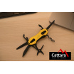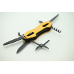 Multifunkční nůž CAMP 7v1 z aluminia žluté metalické barvy, s nástroji z nožířské oceli. Užitečný po