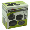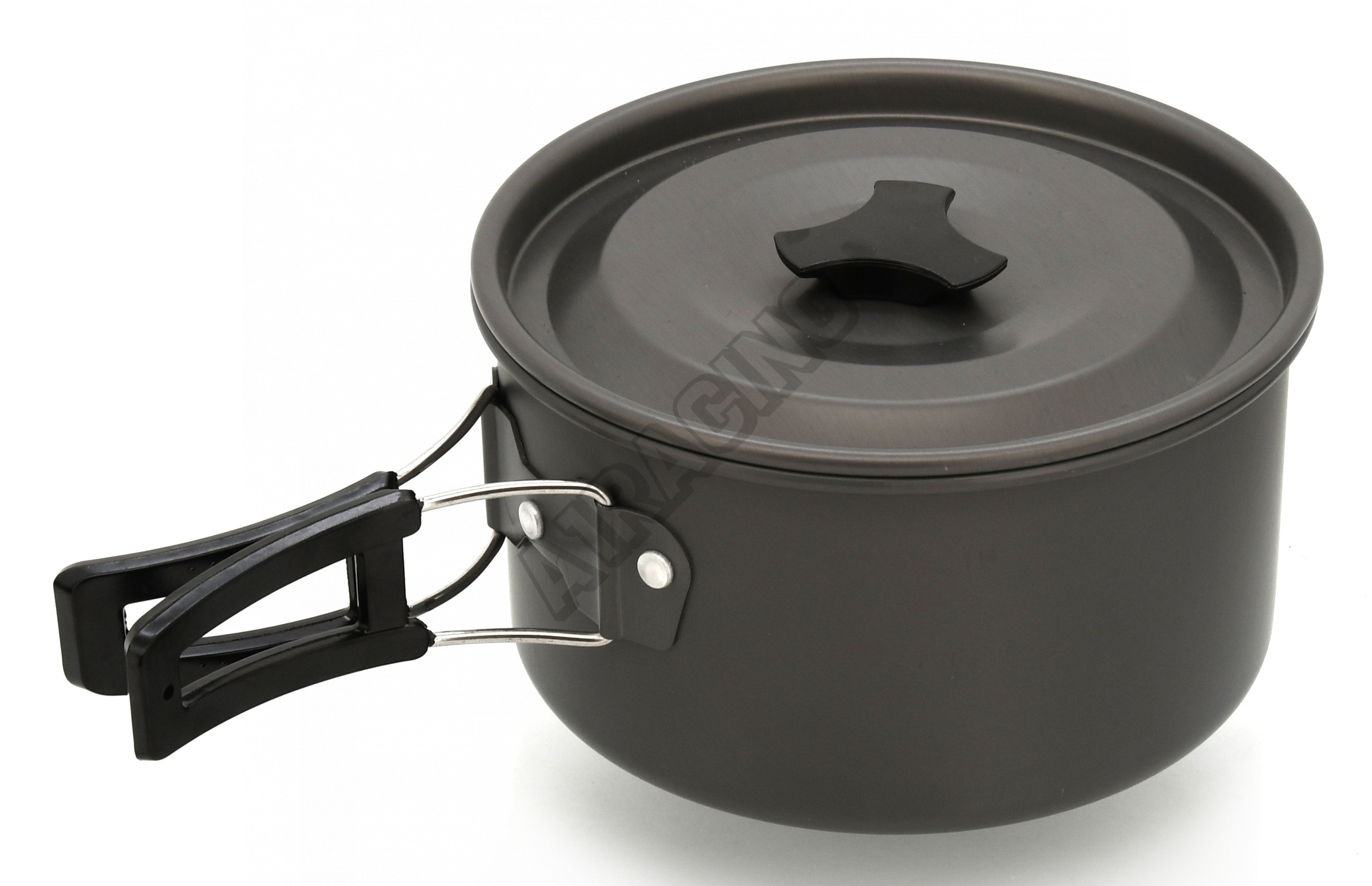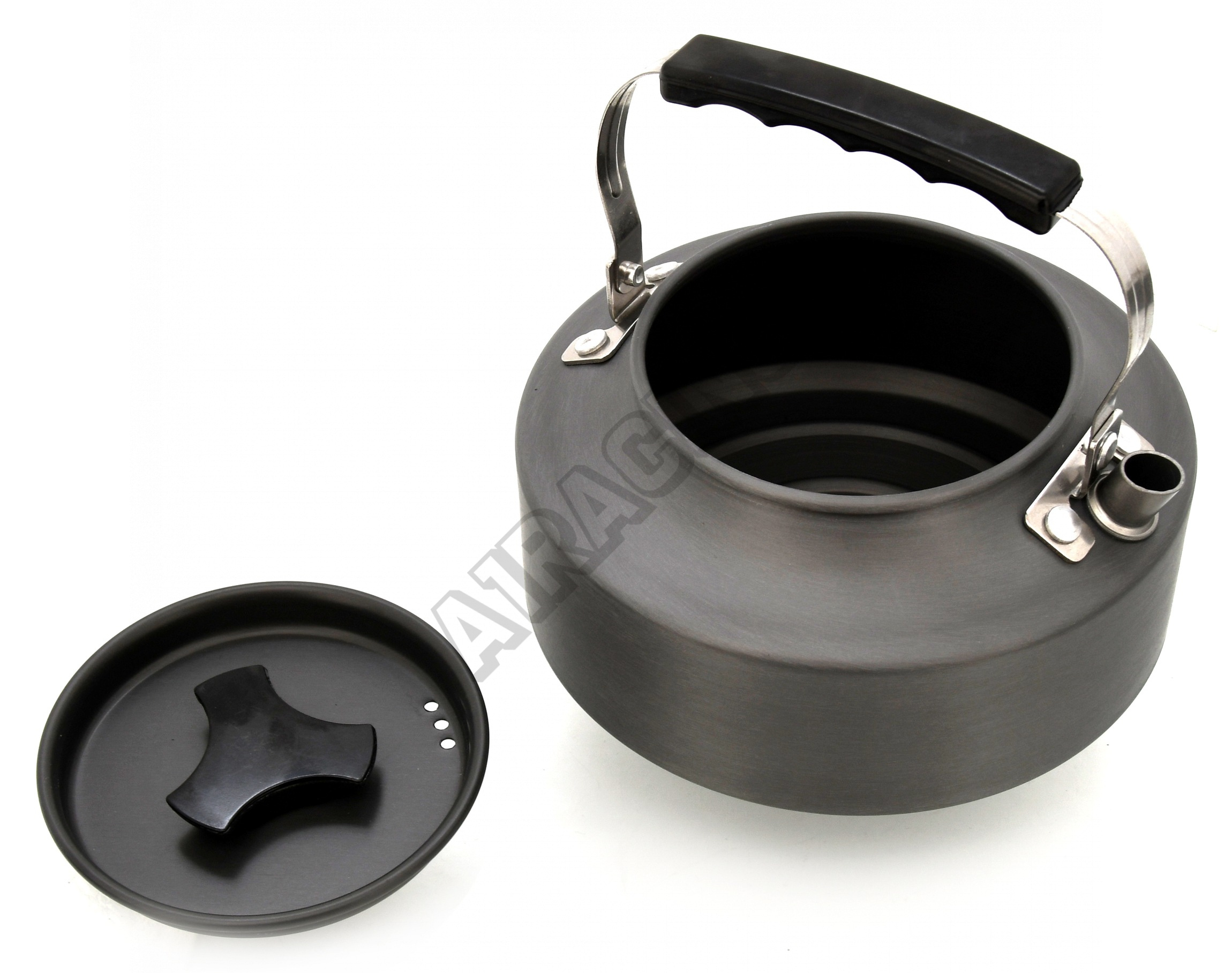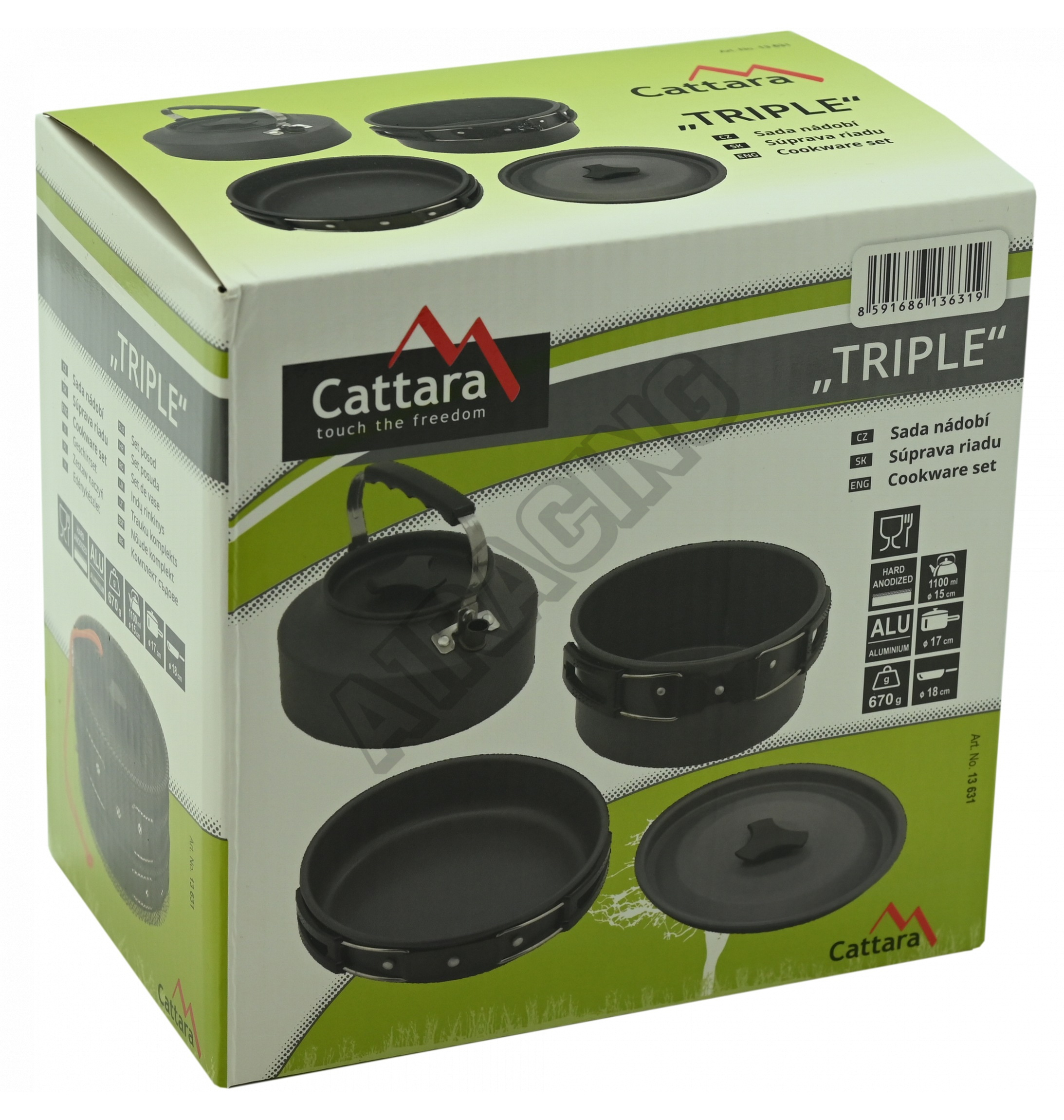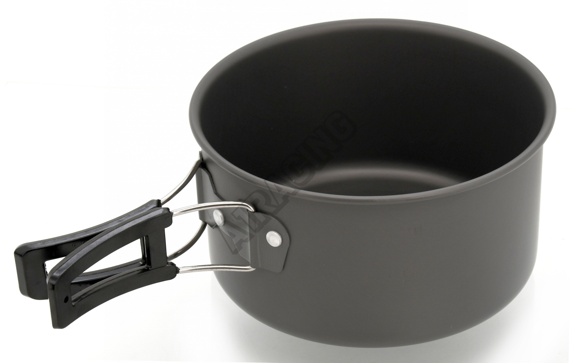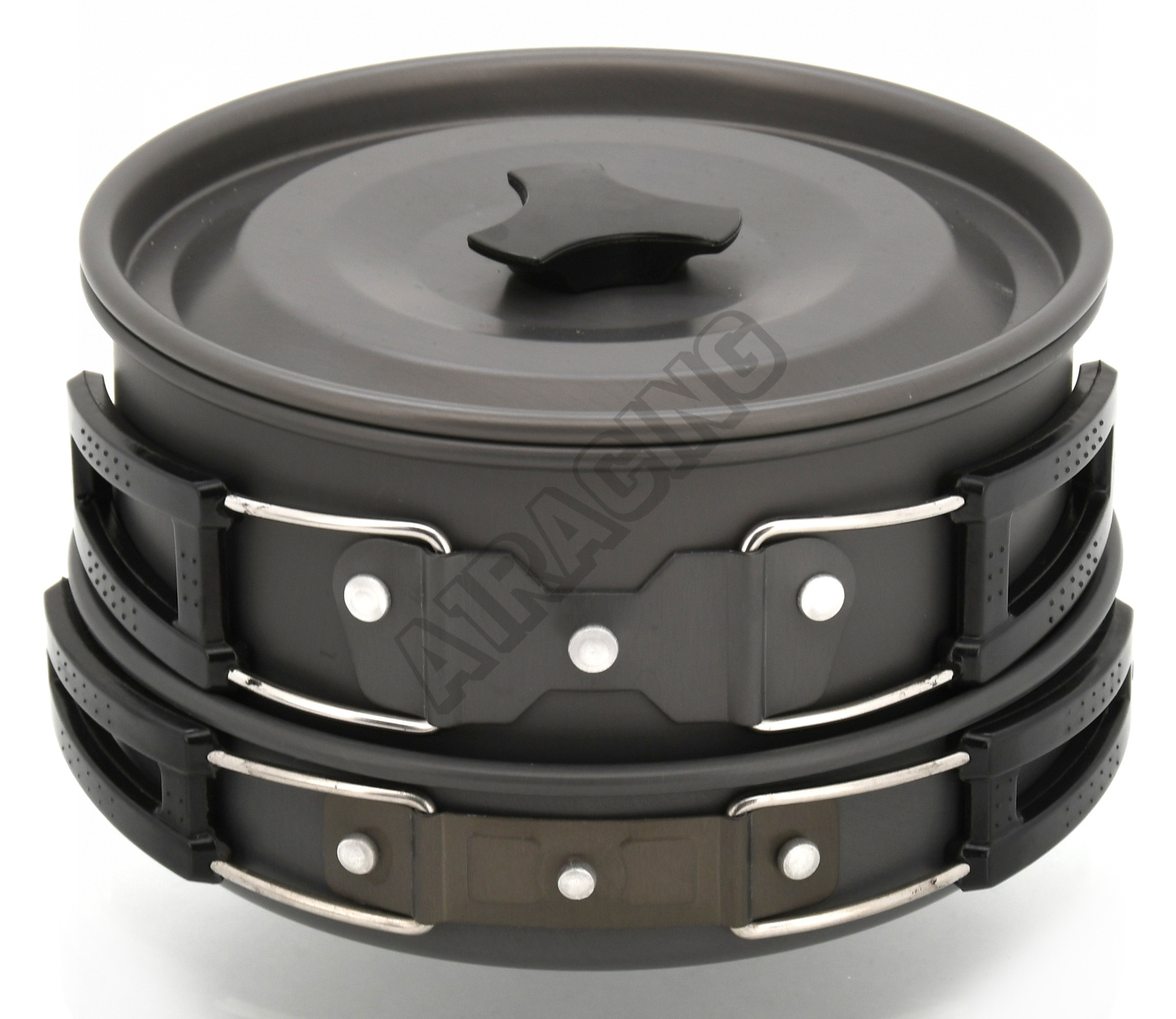 Sada je tvořena pánvičkou 18 x 4 cm, kotlíkem 17 x 9 cm, konvicí 15 x 7,5 cm a víkem průměru 17 cm. Veškeré vybavení je opatřeno sklápěcím držákem, zakončený plastovou rukojetí pro usnadněnou manipulaci.