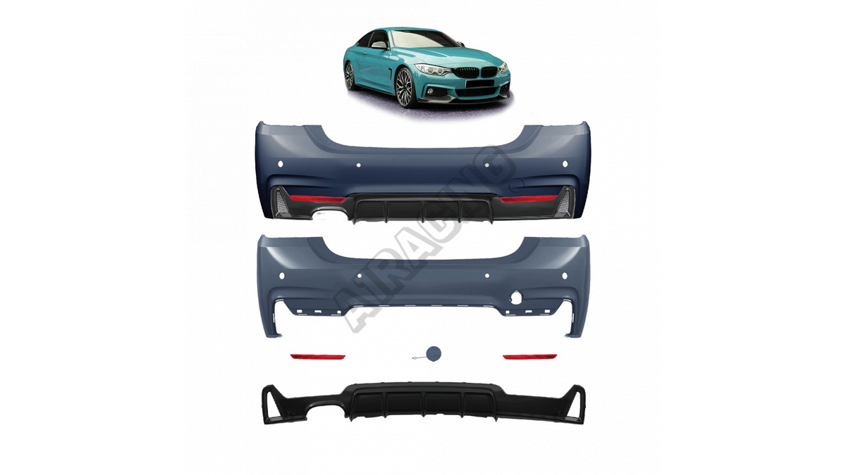 Nezafarbený zadný športový nárazník s difúzorom je vynikajúcim doplnkom pre vaše BMW 4 (F32) Coupe (F33) Cabrio (F36) vyrábané v rokoch 2013-2021.