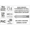 Naviják lze upevnit přímo na zeď. Hadice je zhotovená z PVC materiálu, odolného vůči nízkým i vysokým teplotám, stárnutí a agresivním chemikáliím.