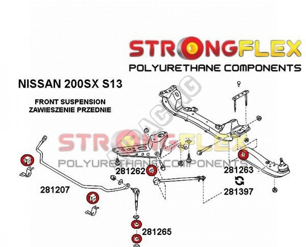 Nissan 200SX S13 1988-93 StrongFlex sestava silentbloků pro přední a zadní nápravu 33 ks obsahuje: