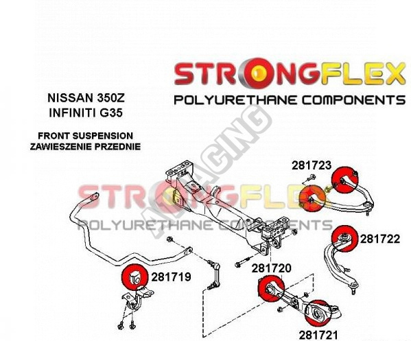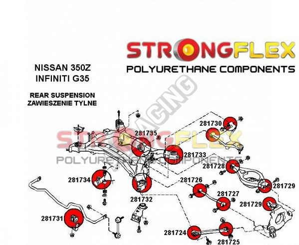 Nissan 350Z StrongFlex Sport (tvrdost 90ShA) kompletní sestava silentbloků na celé auto obsahuje :