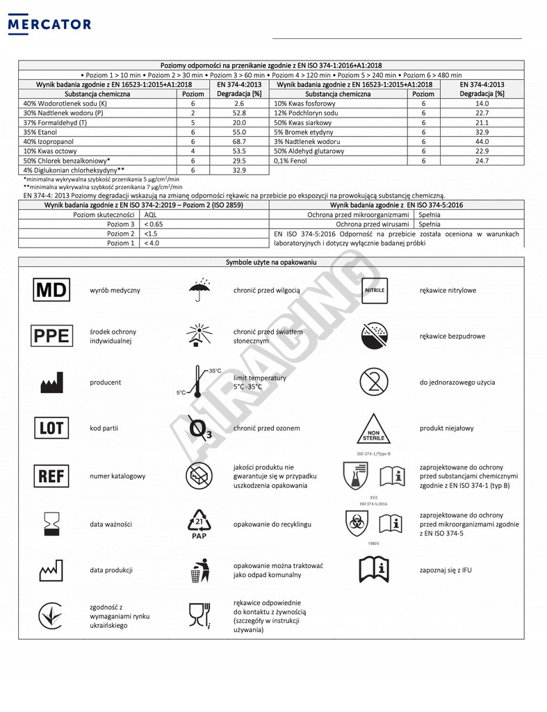 - EN 455-1 požiadavky a skúšky na neprítomnosť dier (úroveň AQL)