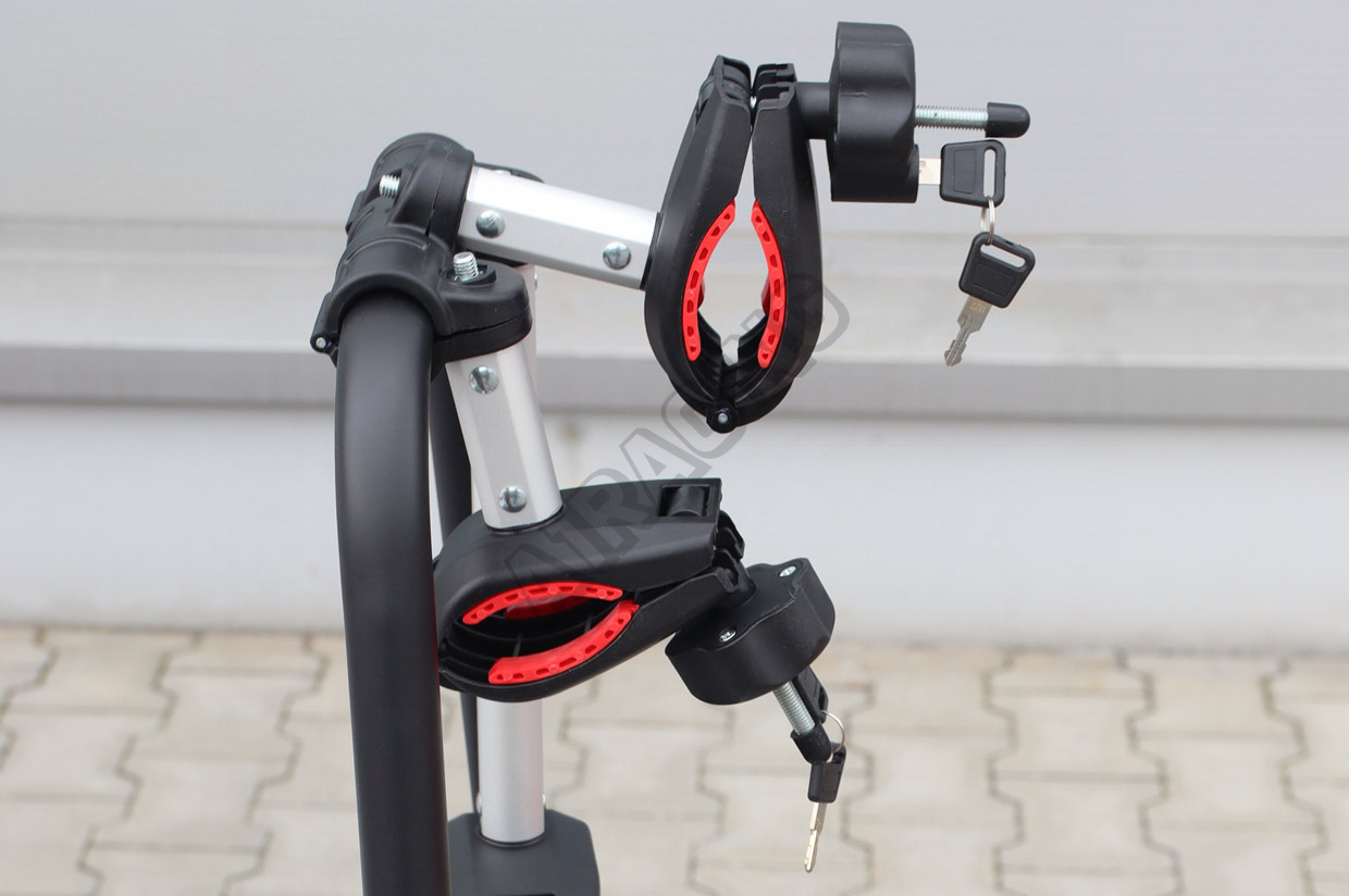 Veľmi pohodlný systém montáže kolies na nosiči - stačí odpojiť úchyty, pretiahnuť cez kolesá, zaistiť zámkom s kľúčom a hotovo