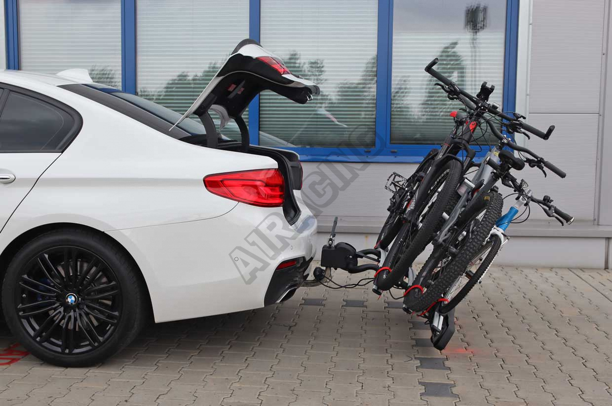 Robustná sklopná platforma montovaná na ťažné zariadenie pre prepravu jedného až troch bicyklov.
