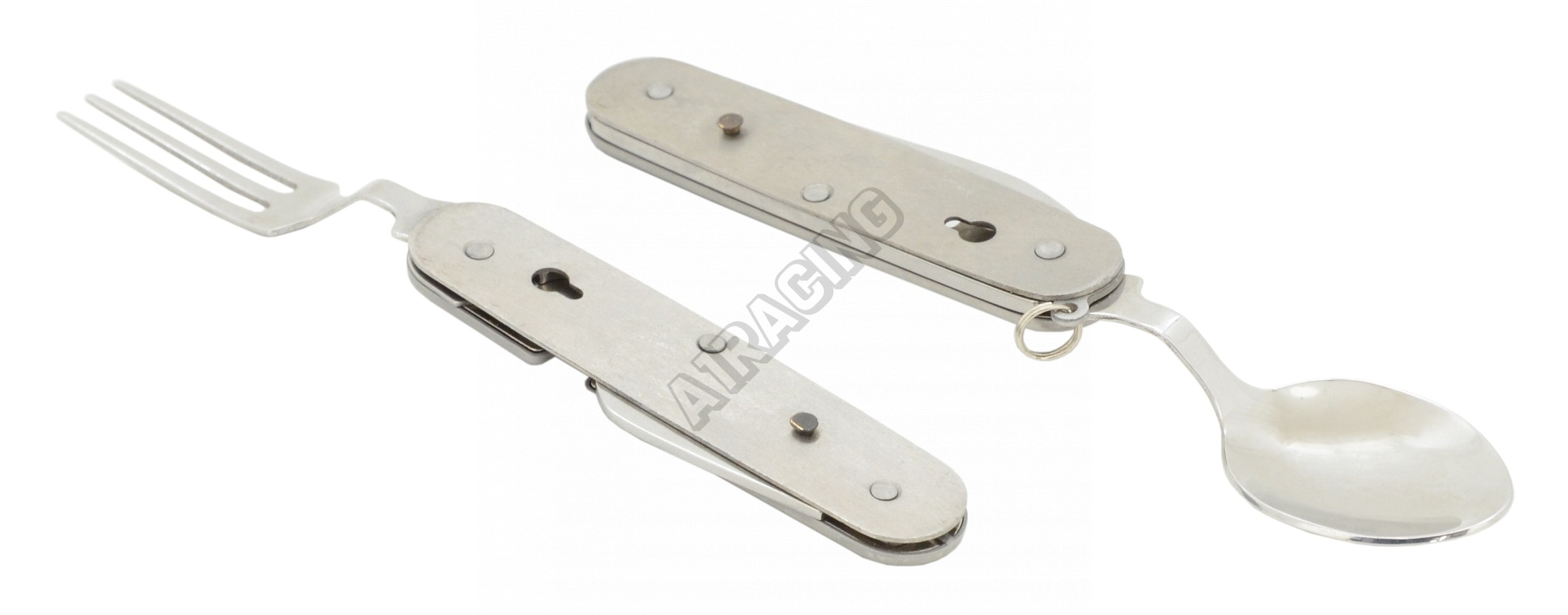 První část nože se skládá z vidličky, otvíráku na plechovky a víčka lahví, druhá část skrývá lžíci a samotnou čepel nože.