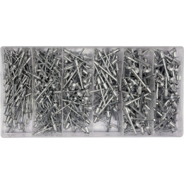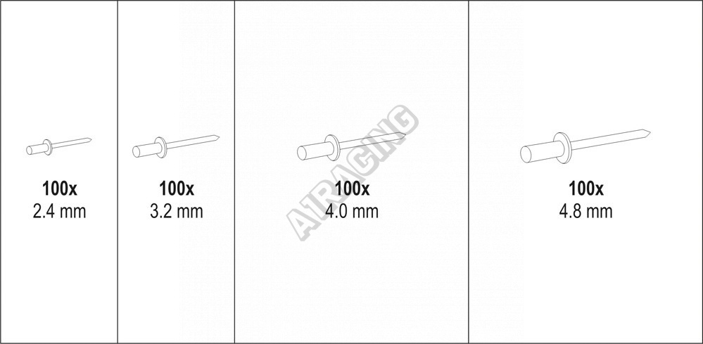 Sada 400 kusů hliníkových nýtů. Sada obsahuje nýty nejčastěji používaných rozměrů. Vše je přehledně