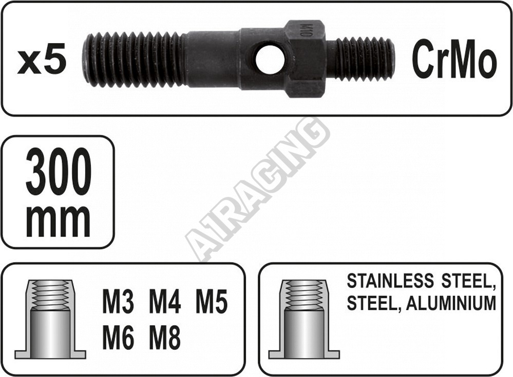 Délka kleští 300 mm, bytelné kovové tělo s gumovými rukojeťmi s precizně opracovanými hlavicemi z nástrojové CrMo oceli. Jsou určeny pro nýty M3 - M8 z nerezové oceli, nebo hliníku.